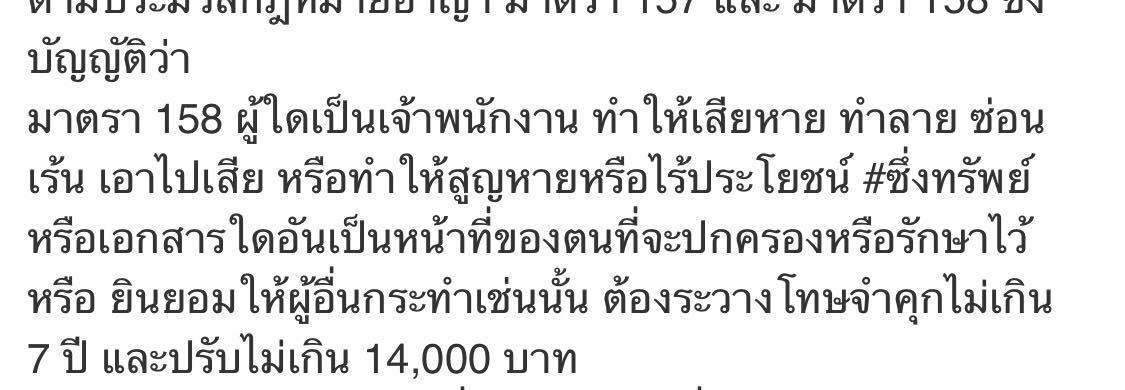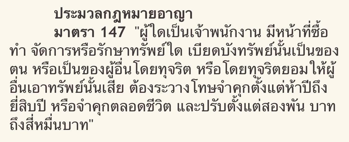 "ผู้ใดเป็นเจ้าพนักงาน มีหน้าที่ซื้อทำ จัดการหรือรักษาทรัพทย์สินใด เบียดบังทรัพท์นั้นเป็นของตน หรือเป็นของผู้อื่นโดยทุจริต หรือโดยทุจริตยอมให้ผู้อื่นเอาทรัพย์นั้นเสียต้องระวางโทษจำคุกตั้งแต่ 5 ปี ถึง 20 ปี หรือจำคุกตลอดชีวิต หรือปรับตั้งแต่สองพันบาทถึง 4 หมื่นบาท "