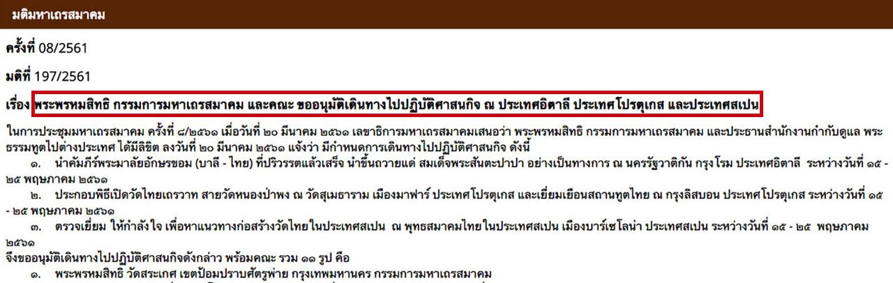 การอนุมัติครั้งล่าสุดนี้ อยู่ในวาระการประชุมมหาเถรสมาคม ครั้งที่ 08/2561 มติที่ 197/2561 ตามที่พระพรหมสิทธิมีลิขิต ลงวันที่ 20 มี.ค. 2561 ที่แจ้งว่า มีกำหนดการเดินทางไปปฏิบัติศาสนกิจ 3 ภารกิจ พร้อมคณะรวม 11 รูป ช่วงวันที่ 15-25 พ.ค.2561 คือ นำคัมภีร์พระมาลัยอักษรขอม (บาลี - ไทย) ที่ปริวรรตแล้วเสร็จ นำขึ้นถวายแด่ สมเด็จพระสันตะปาปา อย่างเป็นทางการ ณ นครรัฐวาติกัน กรุงโรม ประเทศอิตาลี การประกอบพิธีเปิดวัดไทยเถรวาท สายวัดหนองป่าพง ณ วัดสุเมธาราม เมืองมาฟาร์ ประเทศโปรตุเกส และเยี่ยมเยือนสถานทูตไทย ณ กรุงลิสบอน ประเทศโปรตุเกส และตรวจเยี่ยม ให้กำลังใจ เพื่อหาแนวทางก่อสร้างวัดไทยในประเทศสเปน ณ พุทธสมาคมไทยในประเทศสเปน เมืองบาร์เซโลนา ประเทศสเปน
