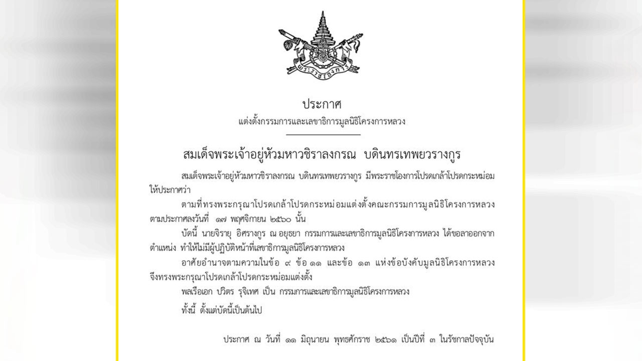 ตามที่ได้ทรงพระกรุณาโปรดเกล้าโปรดกระหม่อมแต่งตั้งคณะกรรมการมูลนิธิโครงการหลวงตามประกาศลงวันที่ 17 พฤศจิกายน 2560
