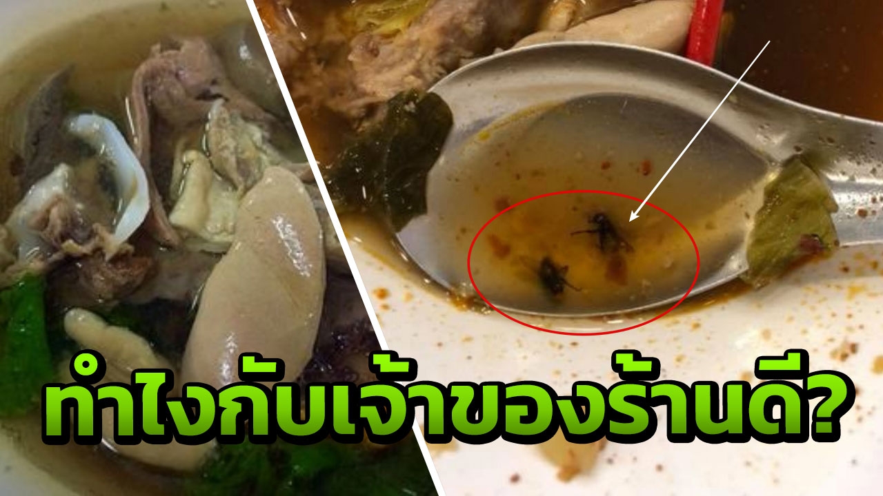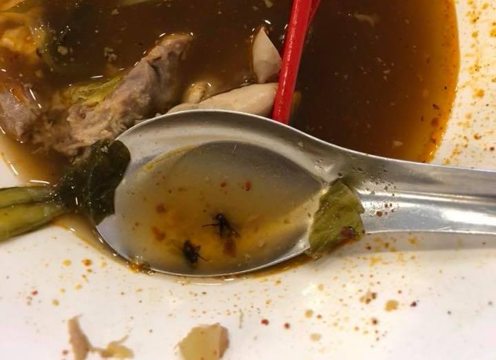 "ไปนั่งกินคนเดียวค่ะ อยากกินทั้งสองอย่างเลยสั่ง พอเขาเอามาเสิร์ฟ เราไม่ได้สังเกตอะไร จัดการปรุงรสตามชอบเสร็จสรรพ ก่อนจะตั้งอกตั้งใจกิน เพื่อจะเดินทางไปทำธุระต่อ กระทั่งสั่งข้าวถ้วยที่ 2 มา พอได้เริ่มกินได้คำเดียว ลองใช้ช้อนตักที่ถ้วยต้มตือฮวน ก็พบแมลงวัน 2 ตัว นอนลอยอ้วนท้วนอยู่ในถ้วย ตอนนั้นคือ อ้วกแทบพุ่ง อิ่มมาก เลยแจ้งพนักงงานว่ามีแมลงวันนะคะ พนักงานก็เฉยเมย เดินไปคุยกับอาซิ้มแก่ๆ เป็นเจ้าของร้าน แล้วก็ซุบซิบอะไรไม่รู้เบาๆ เราเลยเดินตามไปถามว่า สรุปยังไงคะ พนักงานเลยบอกว่า กำลังคุยกับเจ้าของร้าน"