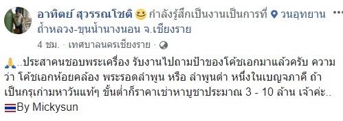 และสำหรับโค้ชเอก ที่พาเด็กๆ ดำรงชีวิตรอดอยู่ได้ ตนเชื่อว่าเป็นเรื่องของสติมากกว่า เพราะโค้ชเองควบคุมสติได้ เอาเด็กๆ อยู่ และเรียนรู้ที่จะดำรงชีวิตอยู่ในถ้ำได้ดี สำหรับพระรอดลำพูนที่โค้ชเอกห้อยอยู่ จะเป็นรุ่นไหนยังไงนั้น คงต้องรอให้พระเอกออกมาจากถ้ำก่อน จะขอเจอตัวพร้อมส่องพระชัดๆ