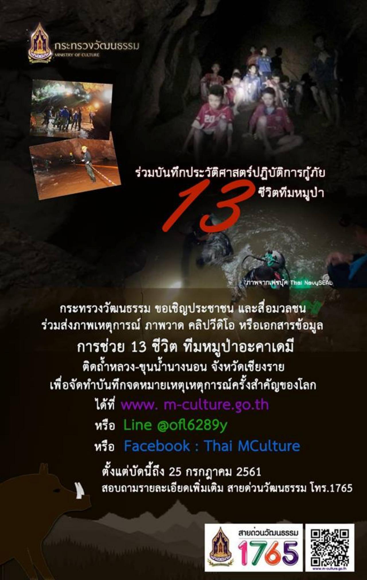 นอกจากนี้ วธ.ยังเปิดให้ประชาชนและสื่อมวลชนมีส่วนร่วมบันทึกเหตุการณ์ประวัติศาสตร์ครั้งนี้ ด้วยการส่งภาพเหตุการณ์ ภาพวาด คลิปวิดีโอ หรือเอกสารข้อมูลการช่วยเหลือ 13 ชีวิต ทีมหมูป่าอะคาเดมี ทั้งภาพการช่วยเหลือ ภาพจิตอาสา บรรยากาศต่างๆ ที่เกี่ยวข้องกับเหตุการณ์ประวัติศาสตร์ เพื่อที่ วธ.นำมารวบรวมจัดทำเป็นจดหมายเหตุบันทึกประวัติศาสตร์ช่วย 13 ชีวิตหมูป่าอะคาเดมี โดยส่งมาที่ www.m-culture.go.th หรือ Line @ofl6289y หรือเฟซบุ๊ก Thai MCulture หัวข้อ บันทึกประวัติศาสตร์ช่วย 13 ชีวิตหมูป่าอะคาเดมี โดยระบุวัน เวลา และสถานที่ถ่ายภาพ ตั้งแต่บัดนี้ถึง 25 ก.ค.2561 โดยสอบถามข้อมูลได้ที่สายด่วนวัฒนธรรม 1765.