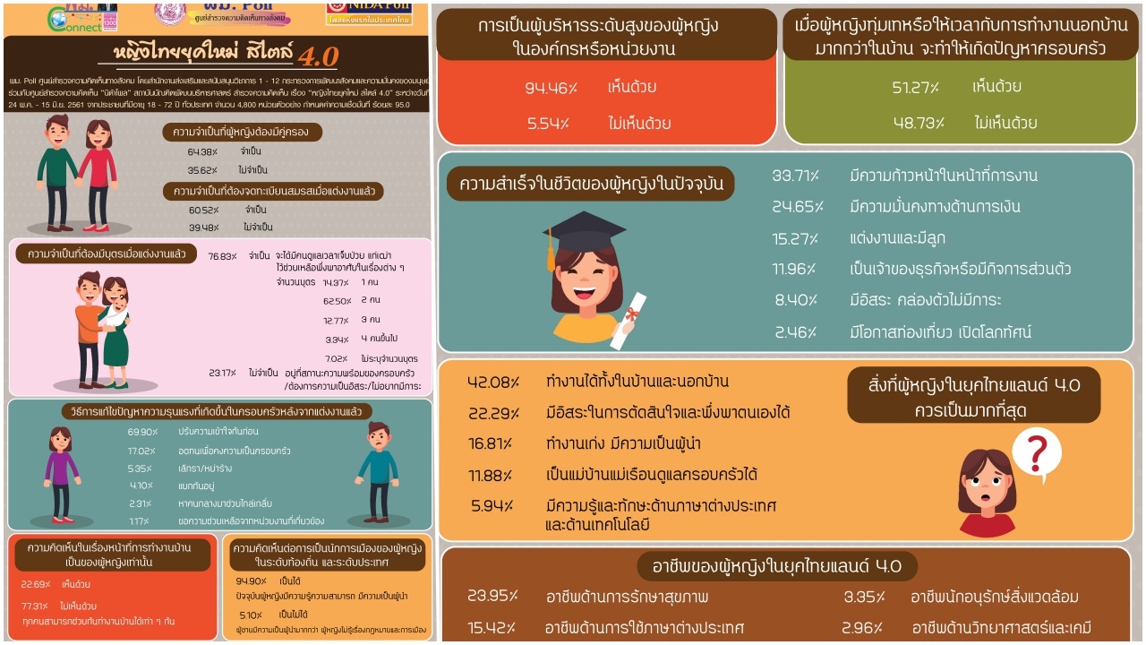 หญิงไทย ยุค 4.0 ยังต้องการคู่ จดทะเบียนสมรส เป็นหลักประกันความมั่นคง และมีลูก ดูแลตอนแก่ ไม่เห็นด้วยงานบ้านต้องเป็นของผู้หญิง ชี้ชายหญิงเท่าเทียม เป็นได้นักการเมือง ยันผู้บริหารระดับสูง...