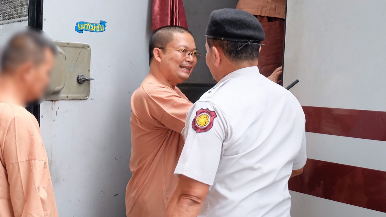 นายวิรพล หรืออดีตหลวงปู่เณรคำ สุขผล โบกมือทักทายเดินขึ้นรถกลับเข้าเรือนจำสีหน้ายิ้มแย้ม หลังศาลตัดสินจำคุก 114 ปี ฐานฉ้อโกงประชาชน ฟอกเงิน ผิด พ.ร.บ.คอมพิวเตอร์ กรณีหลอกสร้างพระแก้วมรกตหยกเขียว.