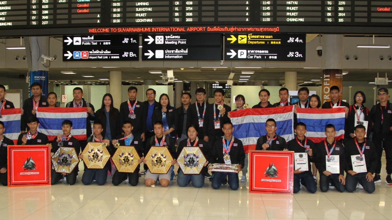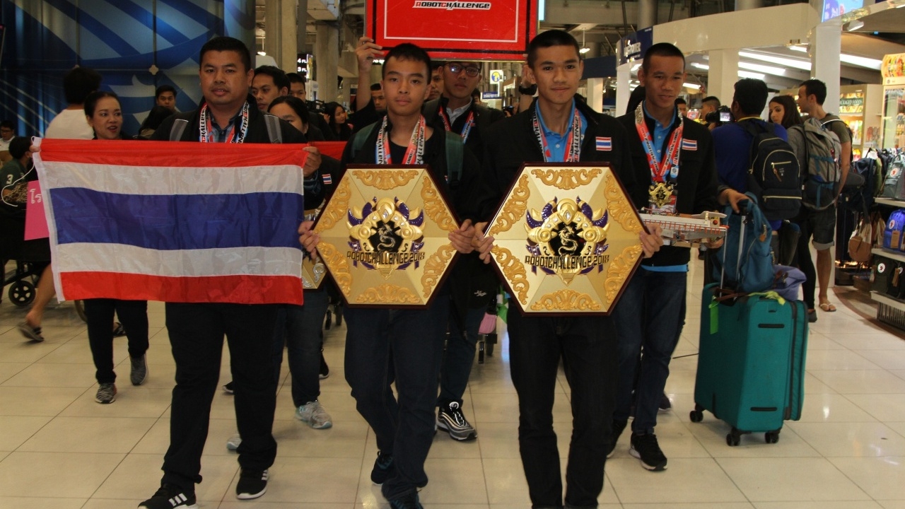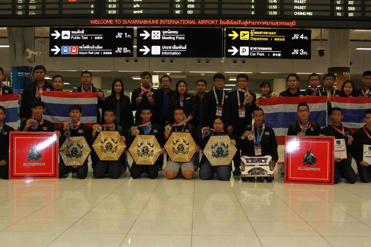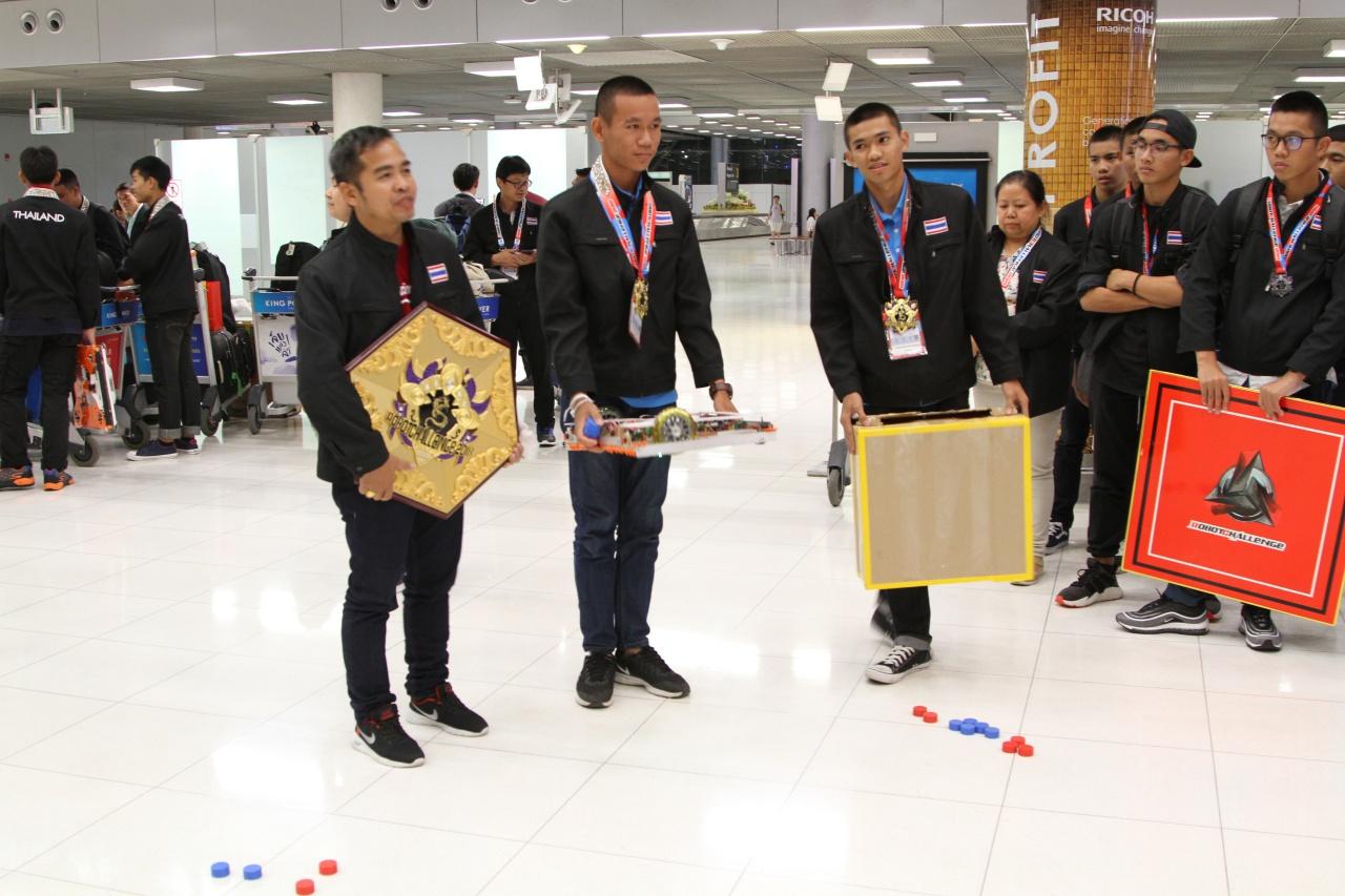 เมื่อเวลา 23.00น. วันที่ 13 ส.ค.2561 นางสาวธัญนันท์ แก้วเกิด ผู้อำนวยการกลุ่มโครงการพิเศษ สำนักพัฒนานวัตกรรมการจัดการศึกษา พร้อมคณะสำนักงานคณะกรรมการการศึกษาขั้นพื้นฐาน (สพฐ.)ให้การต้อนรับนักเรียนไทยพร้อมด้วยครูที่ปรึกษาและผู้ควบคุมการแข่งขัน ที่เดินทางไปแข่งขันหุ่นยนต์นานาชาติในรายการ RobotChallenge 2018 ณ กรุงปักกิ่ง สาธารณรัฐประชาชนจีน ระหว่างวันที่ 9-13 สิงหาคม 2561 ที่เดินทางกลับถึงสนามบินสุวรรณภูมิ อ.บางพลี จ.สมุทรปราการ เวลา 22.05 น. โดยสายการบินไทย เที่ยวบินที่ TG 615