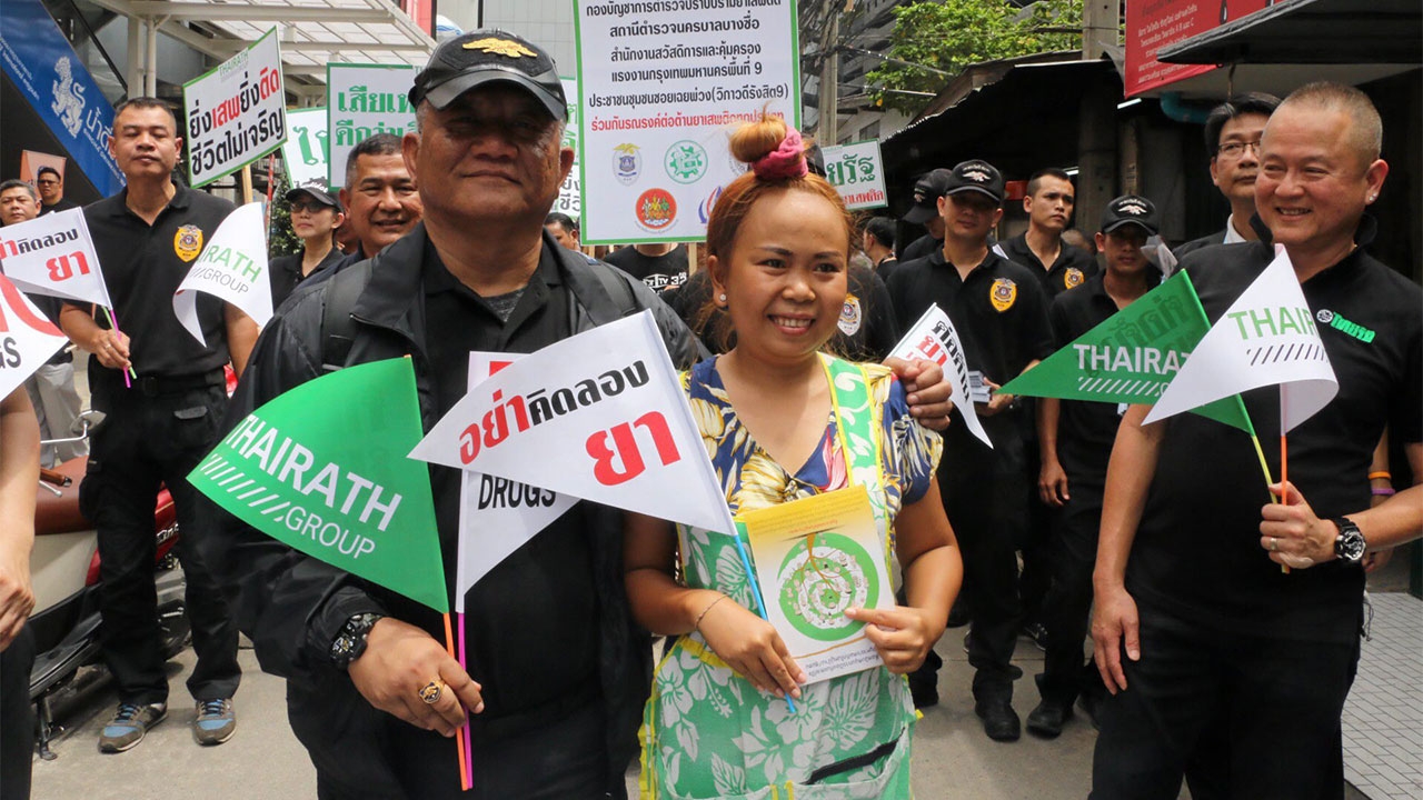 พนักงานบริษัท วัชรพล จำกัด ในนามไทยรัฐ กรุ๊ป ร่วมกับ พล.ต.ท.สมหมาย กองวิสัยสุข ผบช.ปส. เดินถือธงมีข้อความต่อต้านยาเสพติด ภายในซอยเฉยพ่วง เขตจตุจักร กทม. โดยมีชาวบ้านให้ความสนใจจำนวนมาก.