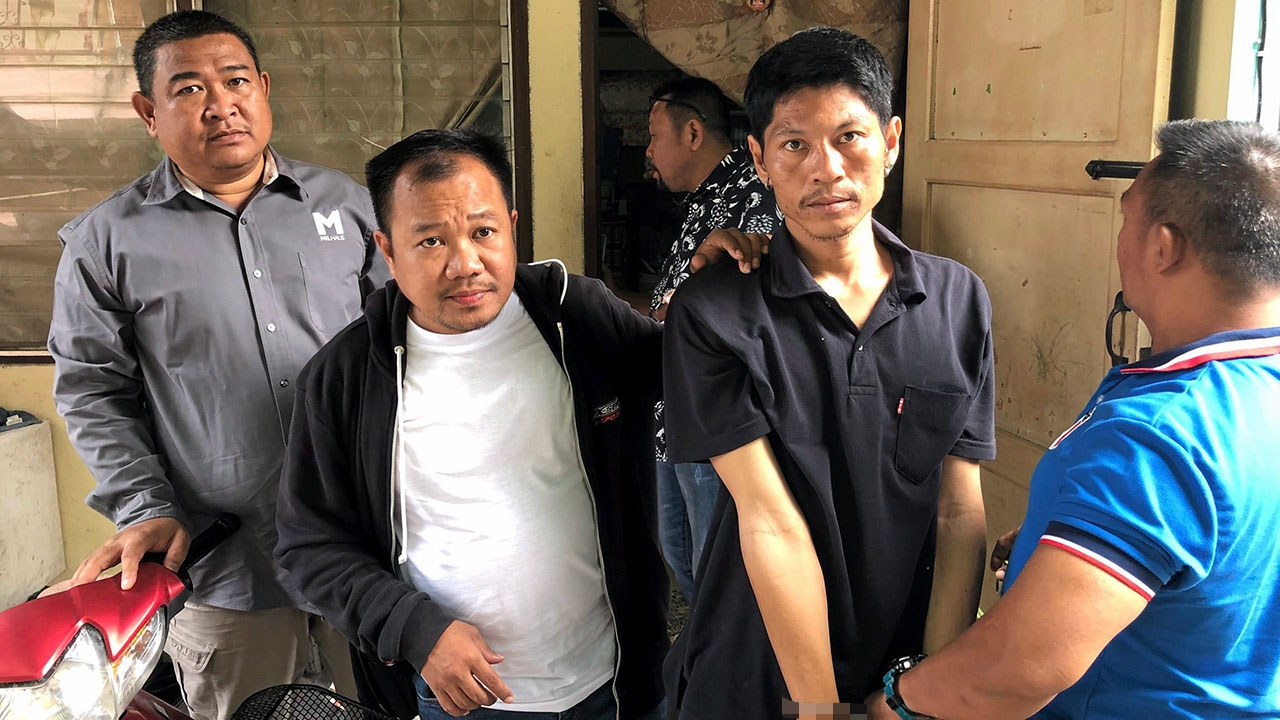 ตำรวจ สน.ห้วยขวาง ควบคุมตัวนายสุรินทร์ หรือบังฮิม ยันตะดิรก (สวมกุญแจมือ) ได้ที่บ้านในซอยรามอินทรา 2 หลังบุกเข้าไปข่มขืนนักศึกษาหญิงในอพาร์ตเมนต์แห่งหนึ่งย่านห้วยขวาง พบประวัติเคยถูกจับหลายครั้ง.