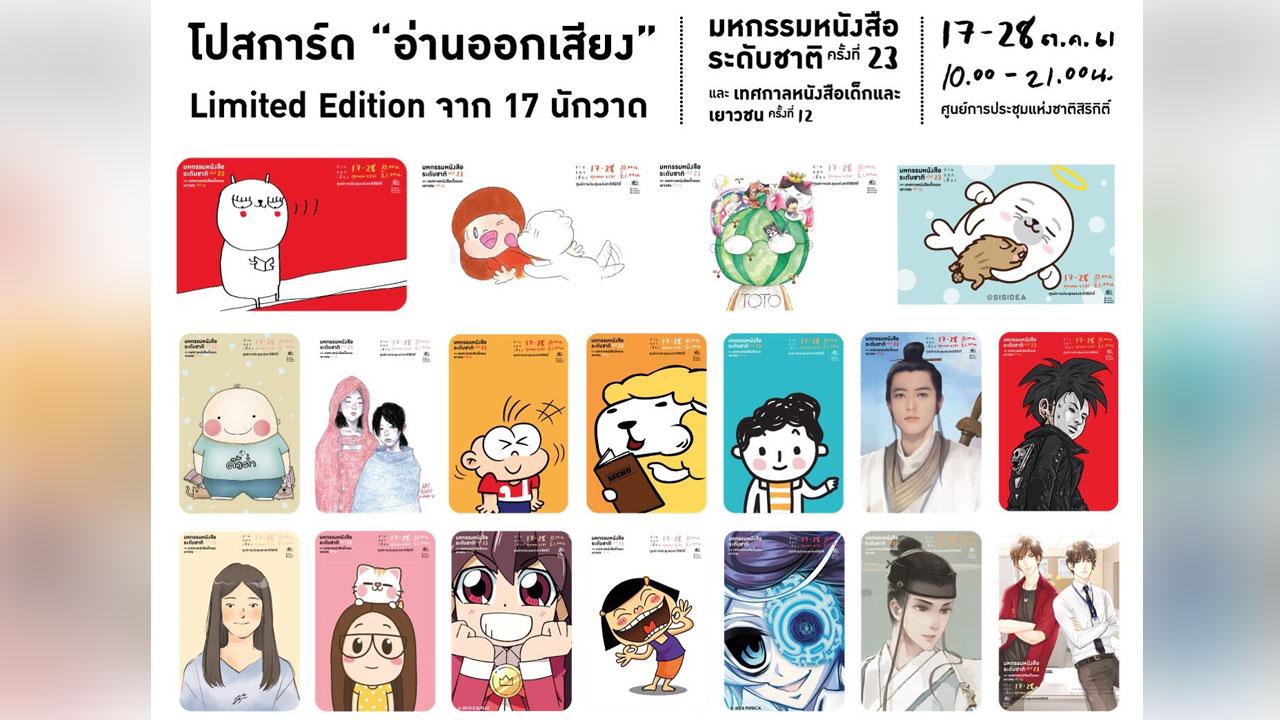 พิเศษสุด โปสการ์ด "อ่านออกเสียง" Limited Edition การผนึกลายเส้นครั้งสำคัญจาก 17 นักวาด ชั้นนำและสำนักพิมพ์ชื่อดัง เริ่มจาก Art Jeeno/Eat all day/Jaytherabbit/Sisidea/คิ้วต่ำ/เดอะดวง/ตัวกลม/ปังปอนด์/มะม่วง/มุนิน/หนูหิ่น/หัวแตงโม/สำนักพิมพ์แจ่มใส/สำนักพิมพ์นาบู/สำนักพิมพ์พราว/สำนักพิมพ์พูนิก้า และสำนักพิมพ์ อี.คิว.พลัส แจกฟรีให้กับผู้เข้าชมงานมหกรรมหนังสือครั้งที่ 23 และสำหรับหนอนหนังสือนักเดินทาง ต้องมารับหนังสือ Guidebook ท่องเที่ยว OTOP นวัตวิถี จากกรมการพัฒนาชุมชนที่จะนำมาแจกฟรีอีกเช่นกัน