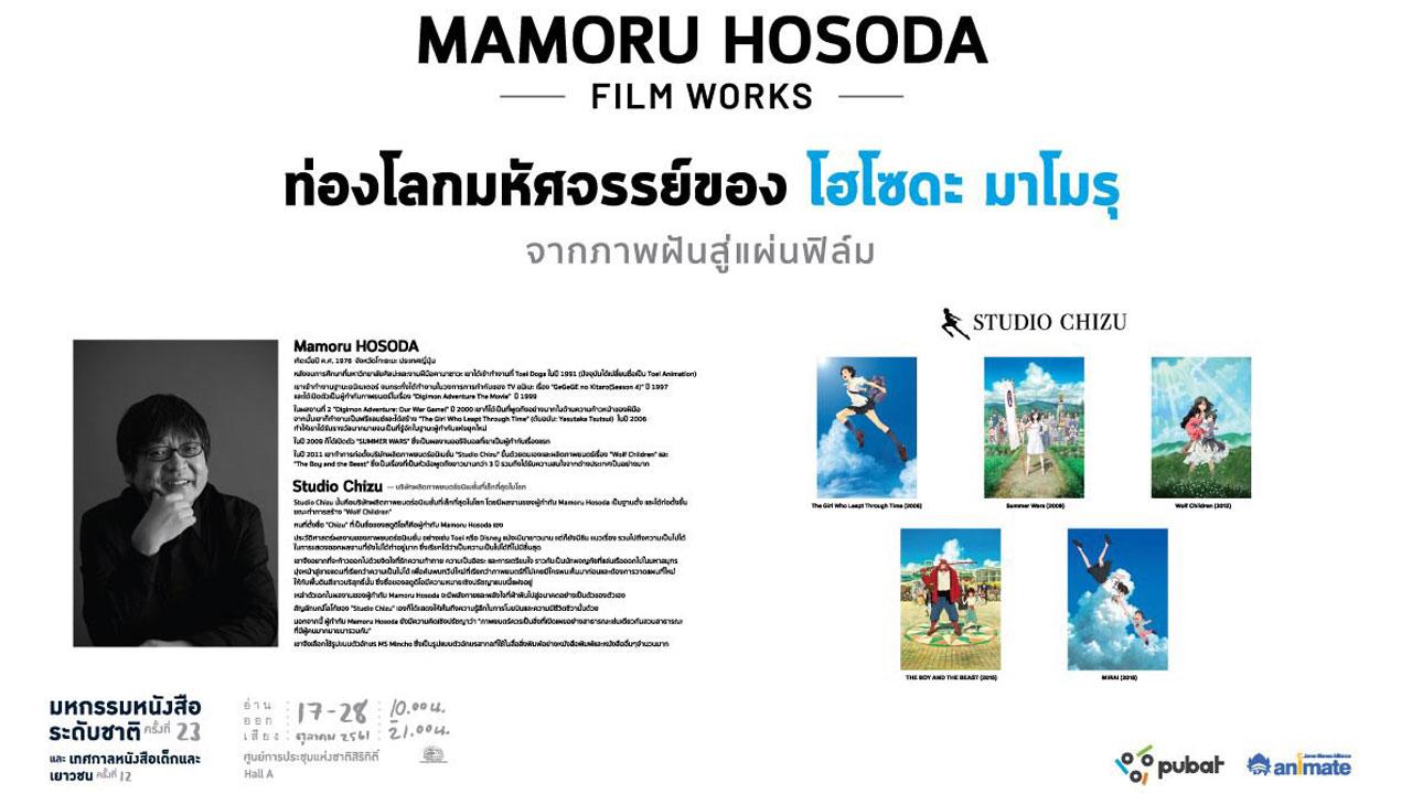 "นิทรรศการท่องโลกมหัศจรรย์ของ HOSODA MAMORU… จากภาพฝันสู่แผ่นฟิล์ม" นิทรรศการระดับโลกที่ผ่านการจัดแสดงทั้งใน กรุงปารีส เซี่ยงไฮ้ โตเกียว และไทเป และส่งตรงมางานมหกรรมหนังสือที่ กรุงเทพฯ โดยนำภาพสเกตช์และสตอรี่บอร์ดจริงของ Hosoda Mamoru (โฮโซดะ มาโมรุ) ผู้กำกับภาพยนตร์อนิเมะชื่อดัง และผลงานที่นำมาจัดแสดงในนิทรรศการครั้งนี้ล้วนมาจากภาพยนตร์ของเขาที่เข้าฉายในประเทศไทย และได้รับการตีพิมพ์เป็นนิยายและหนังสือการ์ตูนในฉบับภาษาไทยอีกด้วย