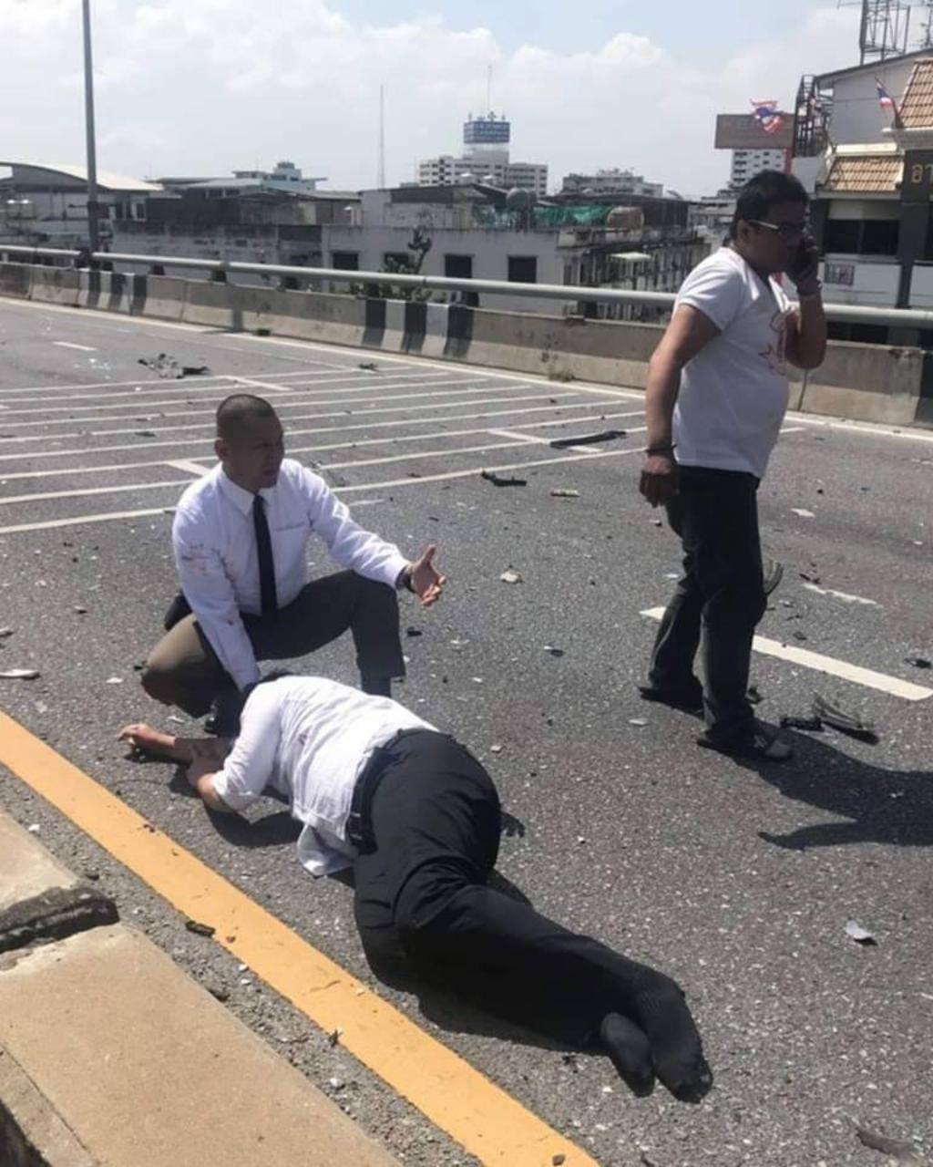 ในระหว่างเกิดเหตุ ร้อยตำรวจเอก ศรัณยพงศ์ อ่อนสิงห์ รองสารวัตรสายตรวจทางหลวง 1 กองกำกับการ 2 กองบังคับการตำรวจทางหลวง กำลังเดินทางไปปฏิบัติหน้าที่นำขบวนเสด็จ สมเด็จพระเทพรัตนราชสุดา สยามบรมราชกุมารี ที่วังสระปทุม แต่พบอุบัติเหตุดังกล่าวและเห็นว่ามีคนติดในรถ จึงลงไปช่วยทุบกระจกเอาผู้ได้รับบาดเจ็บออกมาจากรถได้ ทั้งเครื่องแบบรับเสด็จ โดยไม่สนใจว่าเลือดของผู้ได้รับบาดเจ็บเปรอะเปื้อนตามเสื้อผ้า