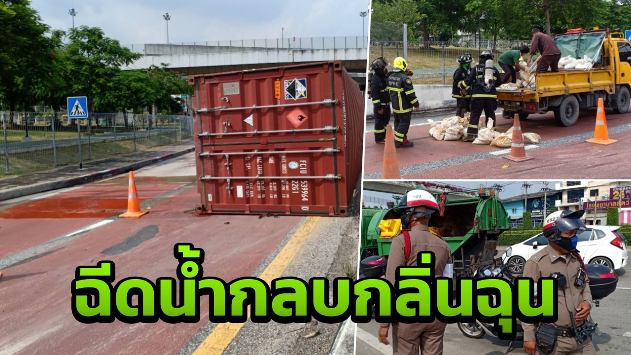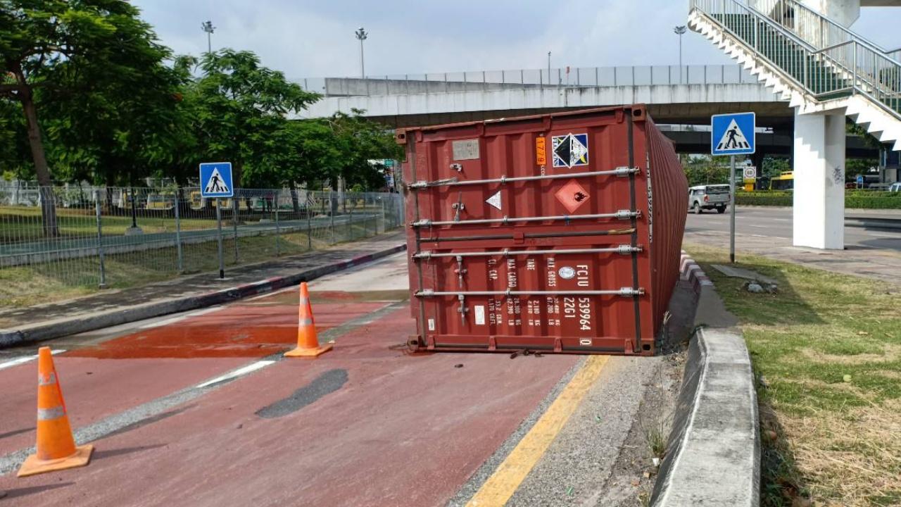 จากนั้น พบตู้คอนเทนเนอร์ขนาด 40 ฟุต ตกหล่นอยู่บนถนน โดยมีน้ำยาเคมีกลิ่นฉุนคล้ายกรดน้ำส้ม ไหลออกมาจากตู้ตลอดเวลา เจ้าหน้าที่จึงปิดการจราจรเอาไว้ก่อน พร้อมประสานรถดับเพลิงมาทำการฉีดน้ำ นำทรายกลบและใช้รถเครนยกออกจากพื้นผิวการจราจร ห่างไป 100 เมตร