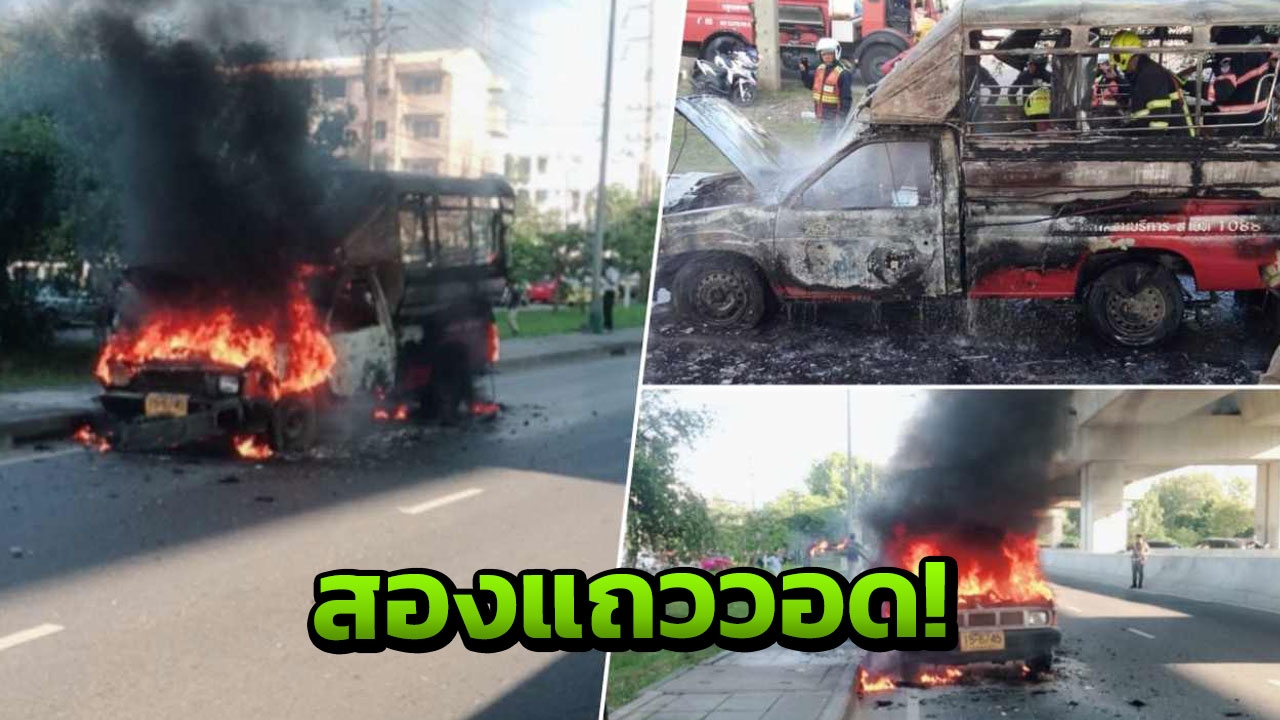สองแถวดอนเมืองวิ่งวนมาเติมแก๊ส เครื่องยนต์ดับคนขับเข็นเข้าข้างทาง ตำรวจจราจรจอดถาม ‘รถเป็นอะไร’ จู่ๆ ไฟลุกพึ่บที่ห้องเครื่องยนต์ ก่อนไหม้วอดทั้งคัน คาดสาเหตุจากไฟฟ้าลัดวงจร