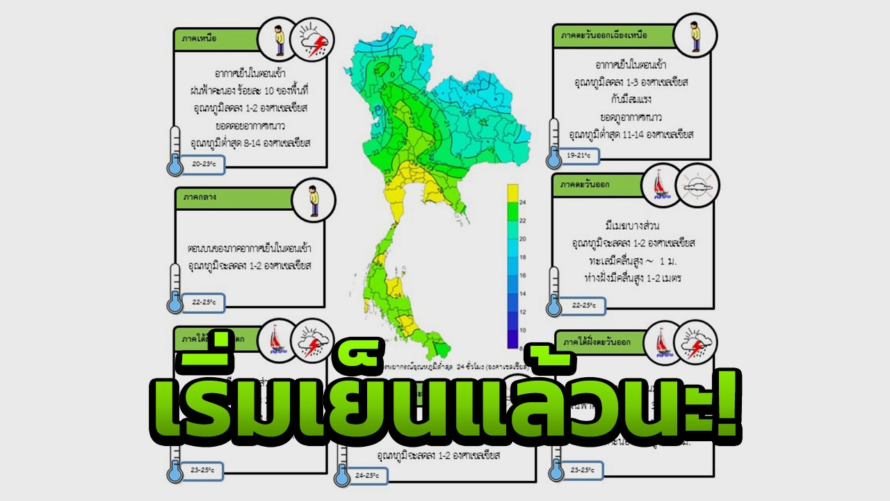 กรมอุตุฯ เผยไทยตอนบนมีอากาศเย็นตอนเช้า อุณหภูมิลดลงได้อีก 1-3 องศา เตือนประชาชนบริเวณดังกล่าวดูแลสุขภาพ ภาคใต้ยังคงมีฝนฟ้าคะนองบางแห่งระยะนี้ ส่วน กทม.-ปริมณฑล อุณหภูมิ ลดลง 1-2 องศา