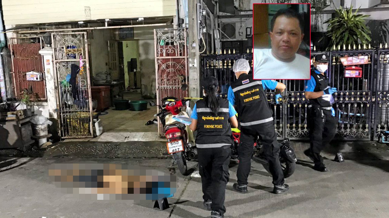 ตำรวจกองพิสูจน์หลักฐานตรวจสอบที่เกิดเหตุ หลัง ด.ต.ศิริมงคล ทองสุข ผบ.หมู่งานจราจร สน.ธรรมศาลา (ภาพเล็ก) ใช้ปืน 9 มม. รัวยิงนายเกรียงศักดิ์ ศรทอง ลูกจ้างร้านหมูกระทะเสียชีวิตที่บริเวณทาวน์เฮาส์ 2 ชั้น ย่านถนนพุทธมณฑล สาย 4 สาเหตุจากรำคาญคู่กรณีชอบส่งเสียงดัง.