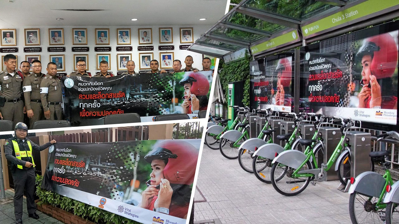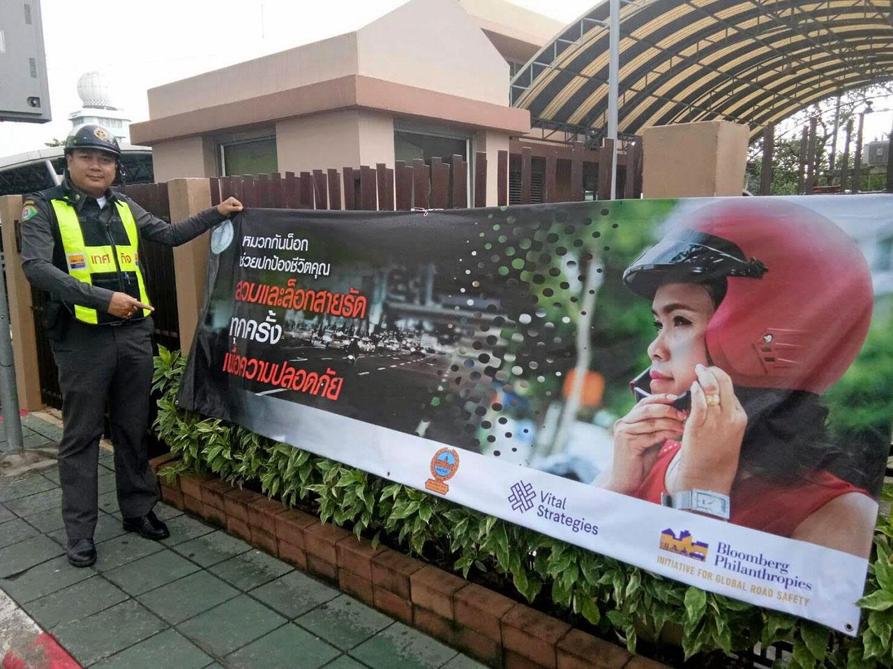 “กรุงเทพมหานคร โดยสำนักการจราจรและขนส่งจึงจัดกิจกรรมการสื่อสารรณรงค์เพื่อสร้างความรู้ความเข้าใจ ปลูกจิตสำนึก ค่านิยม วัฒนธรรมความปลอดภัยในการใช้รถใช้ถนนให้กับประชาชน รวมถึงสนับสนุนการดำเนินงานของกองบัญชาการตำรวจนครบาล ในการรณรงค์ให้ผู้ขับขี่และโดยสารรถจักรยานยนต์สวมหมวกนิรภัย 100 เปอร์เซ็นต์ ผ่านกิจกรรมและสื่อประชาสัมพันธ์ในรูปแบบต่างๆ เช่น “การติดตั้งป้ายรณรงค์สวมหมวกนิรภัยบริเวณสำนักงานเขต ป้ายรณรงค์สวมหมวกนิรภัยบริเวณสถานีจักรยานสาธารณะ 50 สถานี บนถนนสายหลักของกรุงเทพมหานคร ซึ่งเป็นเขตชุมชนขนาดใหญ่ และมีปริมาณรถสัญจรผ่านในบริเวณนั้นจำนวนมาก