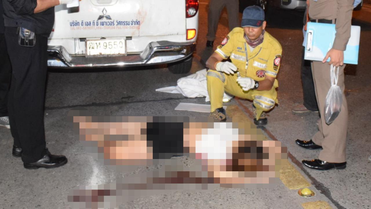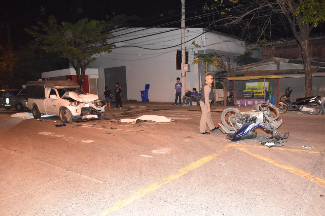 หนุ่มสาวขี่ จยย.ซ้อนท้ายกันมาชนประสานงากับรถกระบะที่สวนมา ร่างกระเด็นแขนขาคอหักผิดรูป ตายคาที่ทั้งคู่ รถจยย.พังยับ บนถนน เลียบคลองภาษีเจริญฝั่งเหนือ เขตหนองแขม ตร.เร่งสอบหาสาเหตุแล้ว...