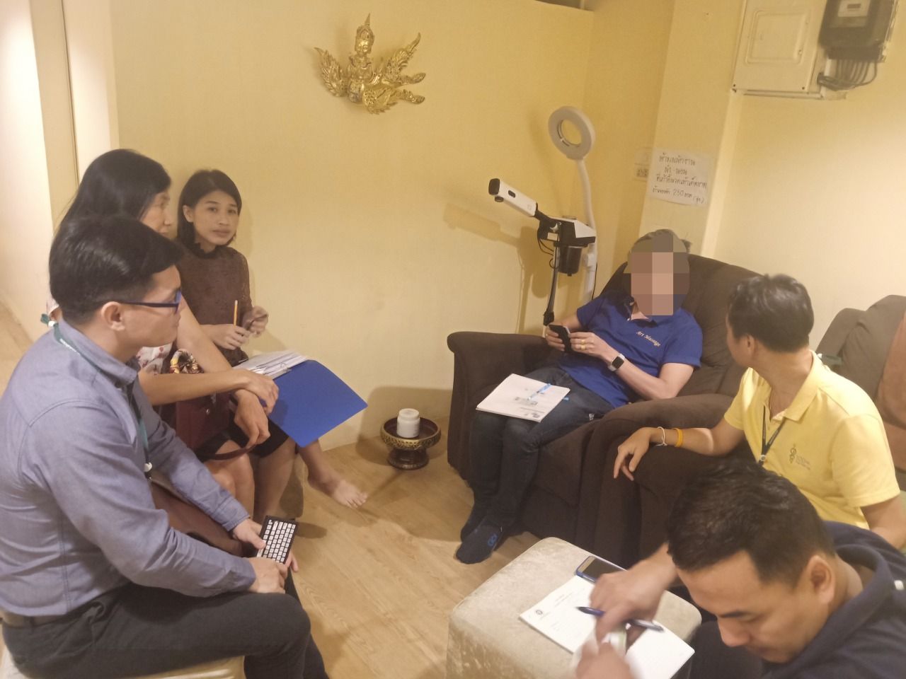 ที่เกิดเหตุเข้าซอยทานตะวันมาประมาณ 200 เมตร เป็นอาคารพาณิชย์สูง 4 ชั้น พบว่ายังเปิดให้บริการตามปกติโดยมีลูกค้าใช้บริการอยู่จำนวน 1 คน ก่อนเชิญตัวผู้จัดการร้านให้นำเอกสารมาแสดงและชี้แจงถึงกรณีดังกล่าว โดยภายในร้านประกอบกิจการนวดเพื่อสุขภาพ ภายในพบว่าประกอบด้วยกัน 3 ชั้น ชั้นล่างเปิดให้บริการนวดฝ่าเท้า มี 7 เตียง ชั้น 2 แบ่งเป็น 3 ห้อง ห้องที่ 1 กับห้องที่ 3 มี 1 เตียง ห้องที่ 2 มี 2 เตียง ทั้ง 3 เป็นห้องปิดตามมาตรฐาน ส่วนชั้น 3 จะเป็นเตียงที่นอนราบกับพื้น มี 7 เบาะ ส่วนจุดเกิดเหตุตามโซเชียลอยู่ในชั้น 2 ห้องที่ 2