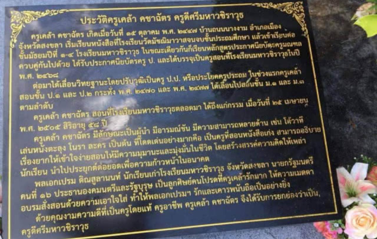 "ป๋าเปรม หรือ ป๋า หรือ พลเอกเปรม ติณสูลานนท์" ผู้ใหญ่ที่บรรพบุรุษเราเคารพรัก เนื่องจากท่านได้ทำคุณงามความดีให้แผ่นดินไทย และพัฒนาความเจริญก้าวหน้าให้บ้านเกิดในจังหวัดสงขลา.... "ป๋าเปรม" ในวันนี้ อายุ 99 ปี ใส่เสื้อเชิ้ตสีชมพูอ่อน ก่อนจะสวมสูททับ มีตัวอักษรที่อกด้านซ้าย ปักสัญลักษณ์ด้วยสีขาวระบุว่า "ม.ว.๑๖๗" ซึ่งเป็นเลขประจำตัวขณะศึกษาในโรงเรียนมหาวชิราวุธ ป๋าเปรมเดินลงจากรถตู้ด้วยท่าทียิ้มแย้มแจ่มใส และพูดจาทักทายกับคณะครู นักเรียน ที่มารอต้อนรับ ก่อนจะกราบอนุสาวรีย์ “ครูเคล้า คชาฉัตร” ซึ่งเป็นอดีตครูดีในดวงใจ .....ท่านได้ยืนสงบนิ่งด้วยความเคารพรักและระลึกถึง ณ อนุสาวรีย์ เป็นเวลาชั่วครู่หนึ่ง