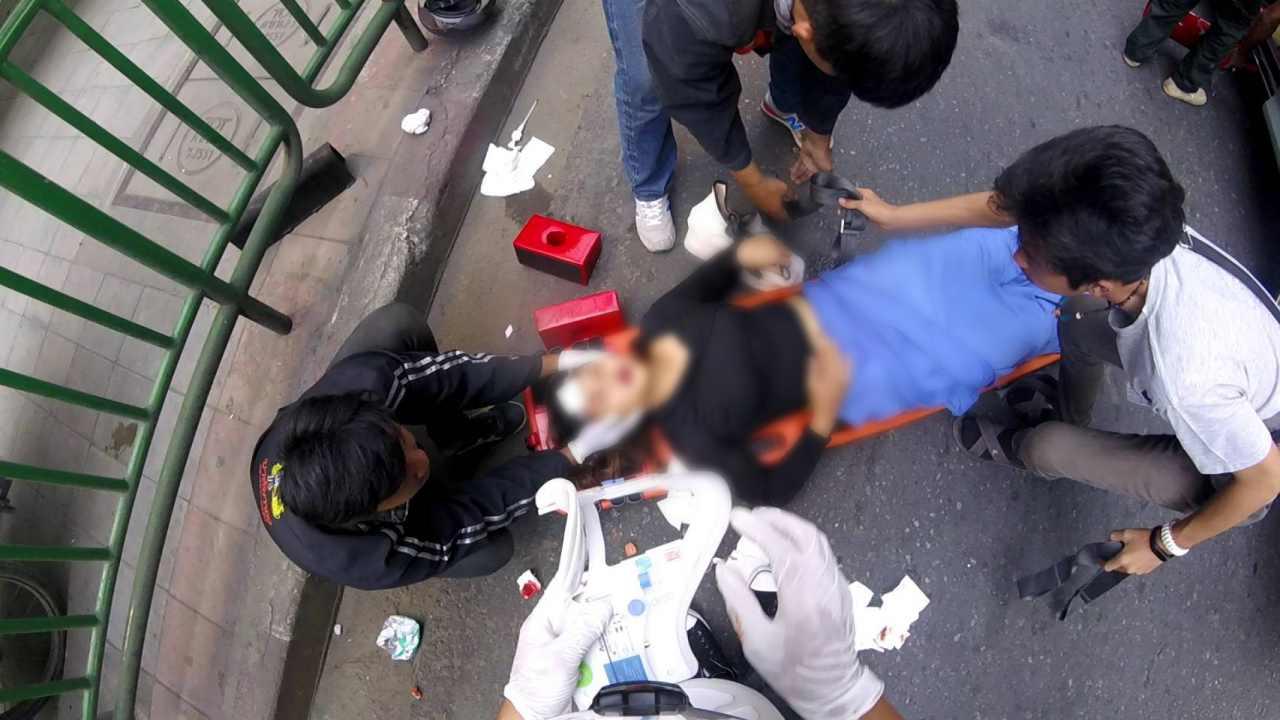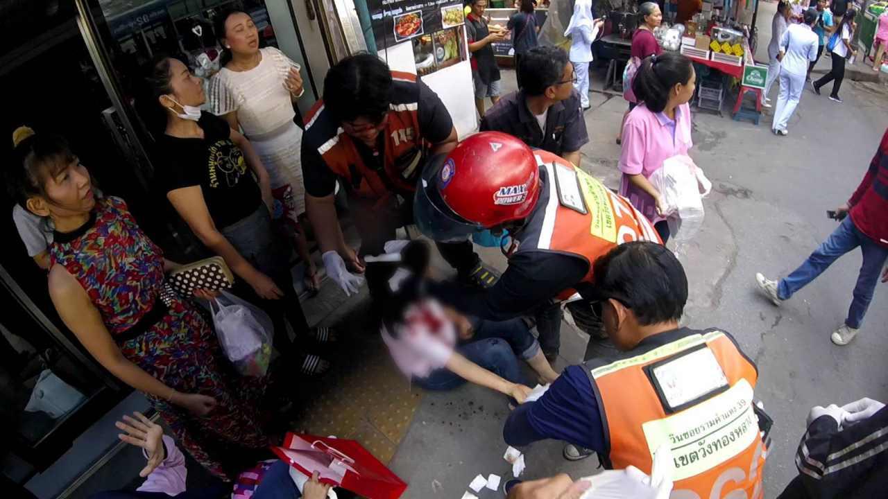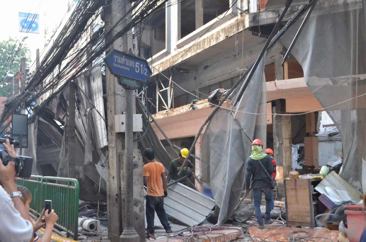ที่เกิดเหตุอยู่ปากซอย พบอาคารไม่มีเลขที่ 4 อาคารปลูกติดกัน สูง 4 ชั้น เป็นตึกร้างได้ถล่มลงมาพังกันสาดล้ำมาในฟุตปาท พบผู้บาดเจ็บ 2 ราย คือ 1.น.ส.โสภิตา ทองเกิด อายุ 23 ปี ถูกนำตัวส่ง รพ.เพชรเวช 2.น.ส.นภาพร ศรีบุญเรือง อายุ 54 ปี ถูกนำส่งรพ.รามคำแหง ทั้ง 2 รายเป็นประชาชนเดินริมถนนโดนเศษอิฐเศษปูนหล่นใส่ศีรษะแตกและมีบาดแผลถลอกตามร่างกาย เบื้องต้นอาการปลอดภัย ขณะเดียวกัน เจ้าหน้าที่ได้ปิดการจราจร 1 ช่องทางเลนซ้ายสุด เพื่อป้องกันเศษปูนที่หล่นลงมาจากอาคาร