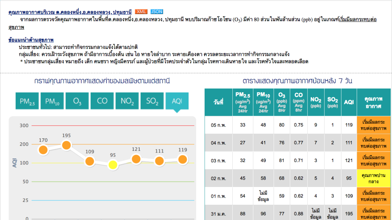 มลพิษทางอากาศที่ตรวจพบเกินมาตรฐาน ได้แก่ ก๊าซโอโซน (O3) ตรวจพบค่าระหว่าง 7-80 ส่วนในพันล้านส่วน (ppb) เกินมาตรฐานที่บริเวณ ต.คลองหนึ่ง อ.คลองหลวง ปทุมธานี