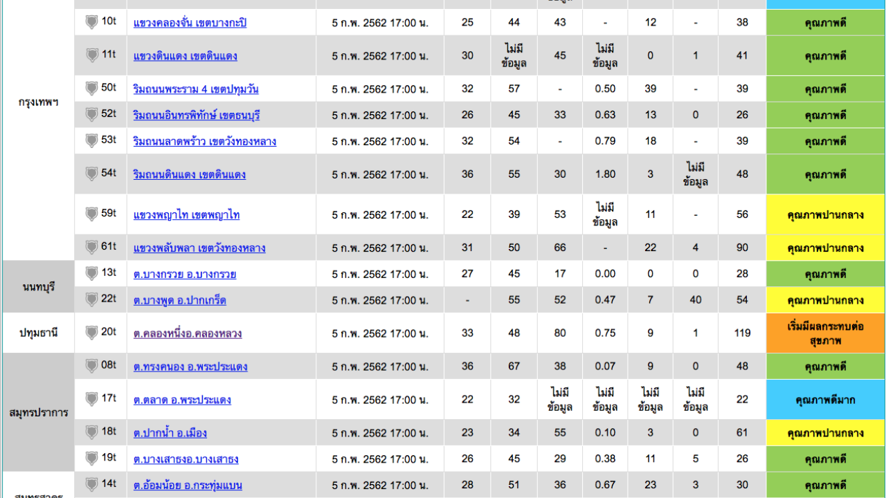 วันที่ 5 ก.พ. ผู้สื่อข่าวรายงานว่า สถานการณ์คุณภาพอากาศ พื้นที่กรุงเทพฯและปริมณฑล ในวันตรุษจีนนี้ คุณภาพอากาศในหลายพื้นที่ ยังอยู่ในระดับ คุณภาพดีมากถึงคุณภาพเริ่มมีผลกระทบต่อสุขภาพ (สีส้ม) บริเวณพื้นที่ ต.คลองหนึ่ง อ.คลองหลวง จ.ปทุมธานี ค่า ดัชชีคุณภาพอากาศ AQI พุ่ง 119