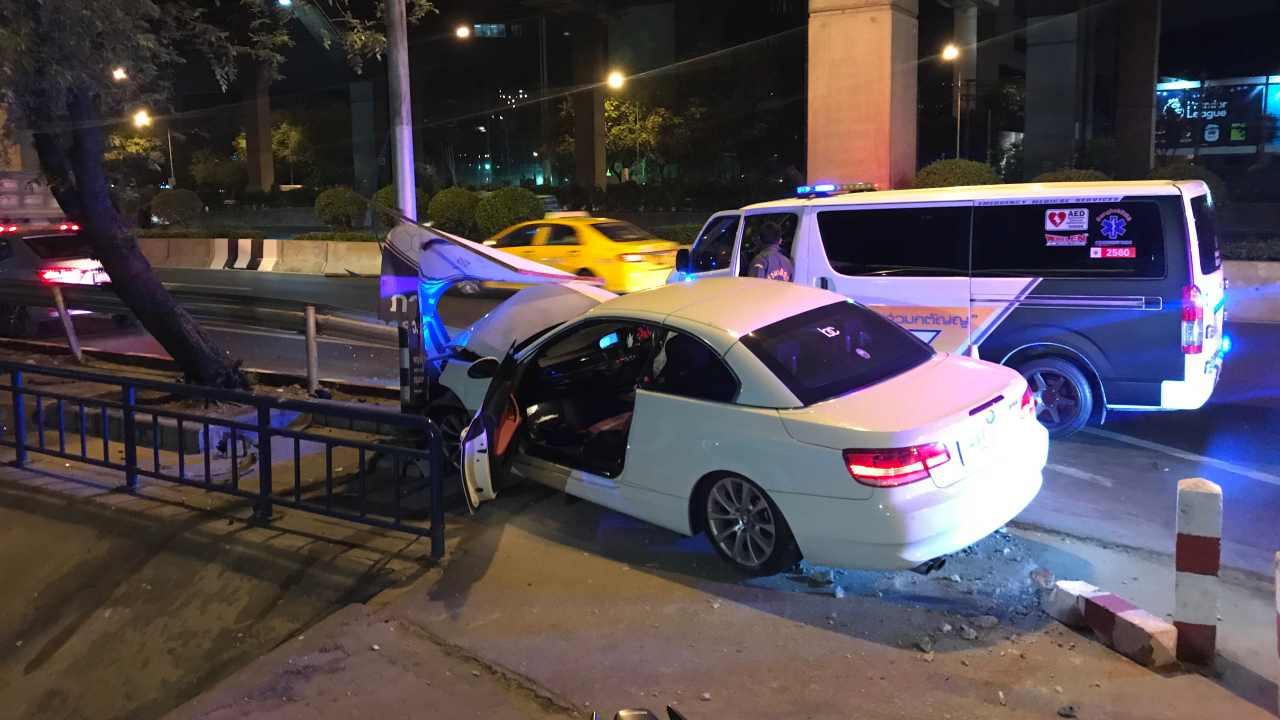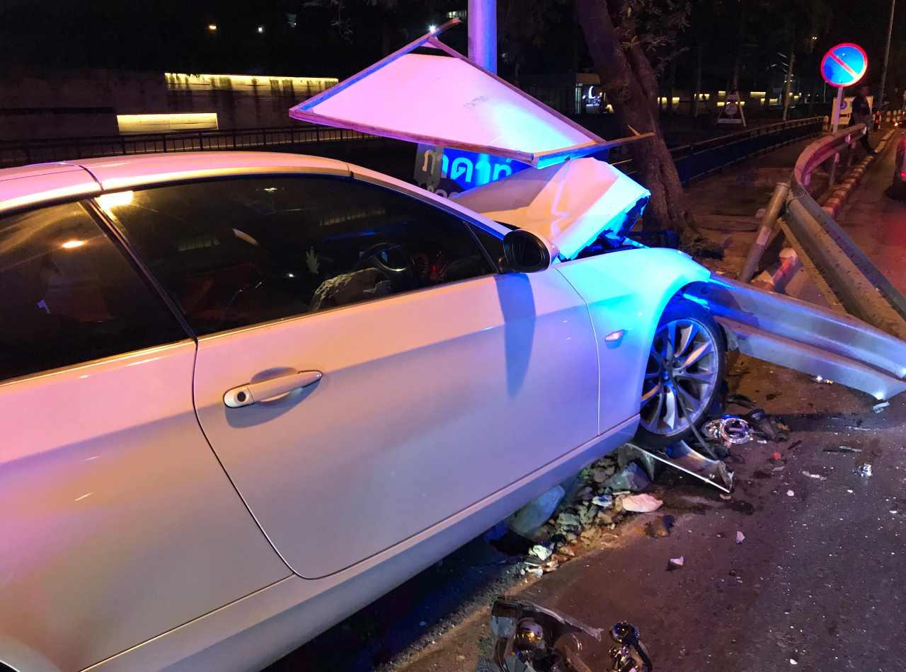 "ไฮโซบอส" อดีตคนรู้ใจนางเอกช่อง 3 ซิ่งเก๋งบีเอ็ม ขนเสาไฟฟ้าส่องสว่างริมถนนวิภาวดีฯ หน้าสำนักงานหนังสือพิมพ์ ไทยรัฐ ช่วงเช้ามืด รถพังยับ เจ้าตัวแค่บาดเจ็บเล็กน้อย