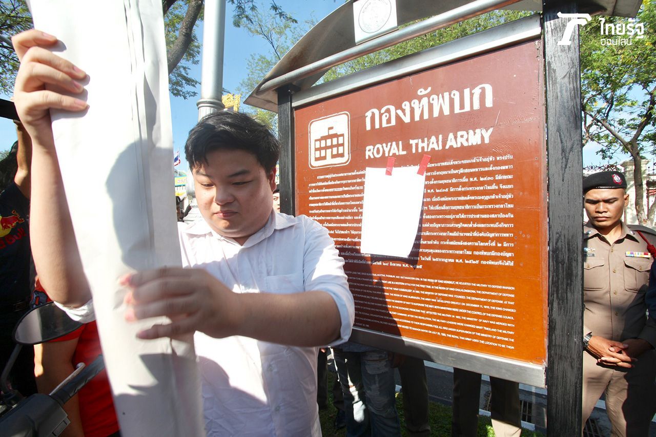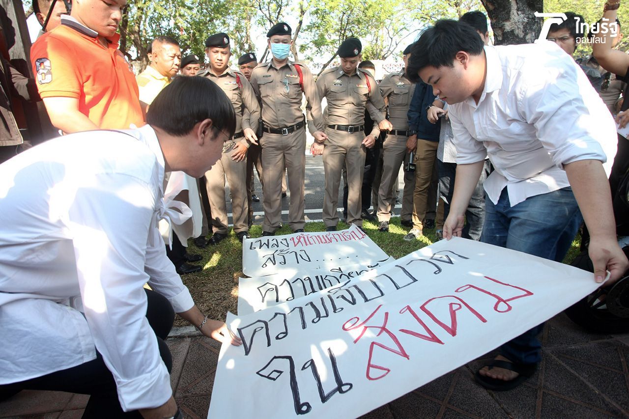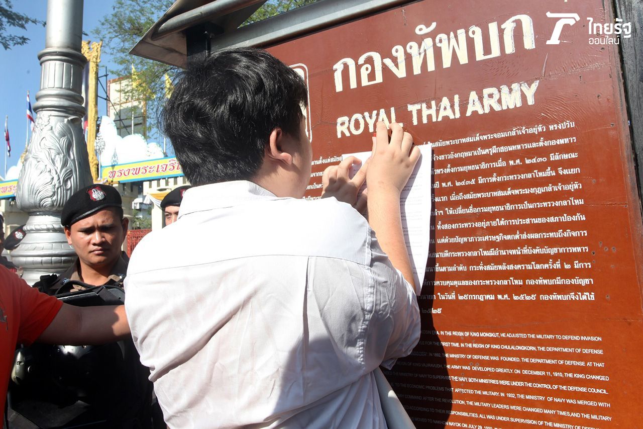 กลุ่มคนอยากเลือกตั้ง บุกหน้ากองบัญชาการกองทัพบก ยื่นหนังสือ "บิ๊กแดง" ขอยุติเปิดเพลง "หนักแผ่นดิน" ล่าสุดถูกคุมตัวไป สน. แล้ว...