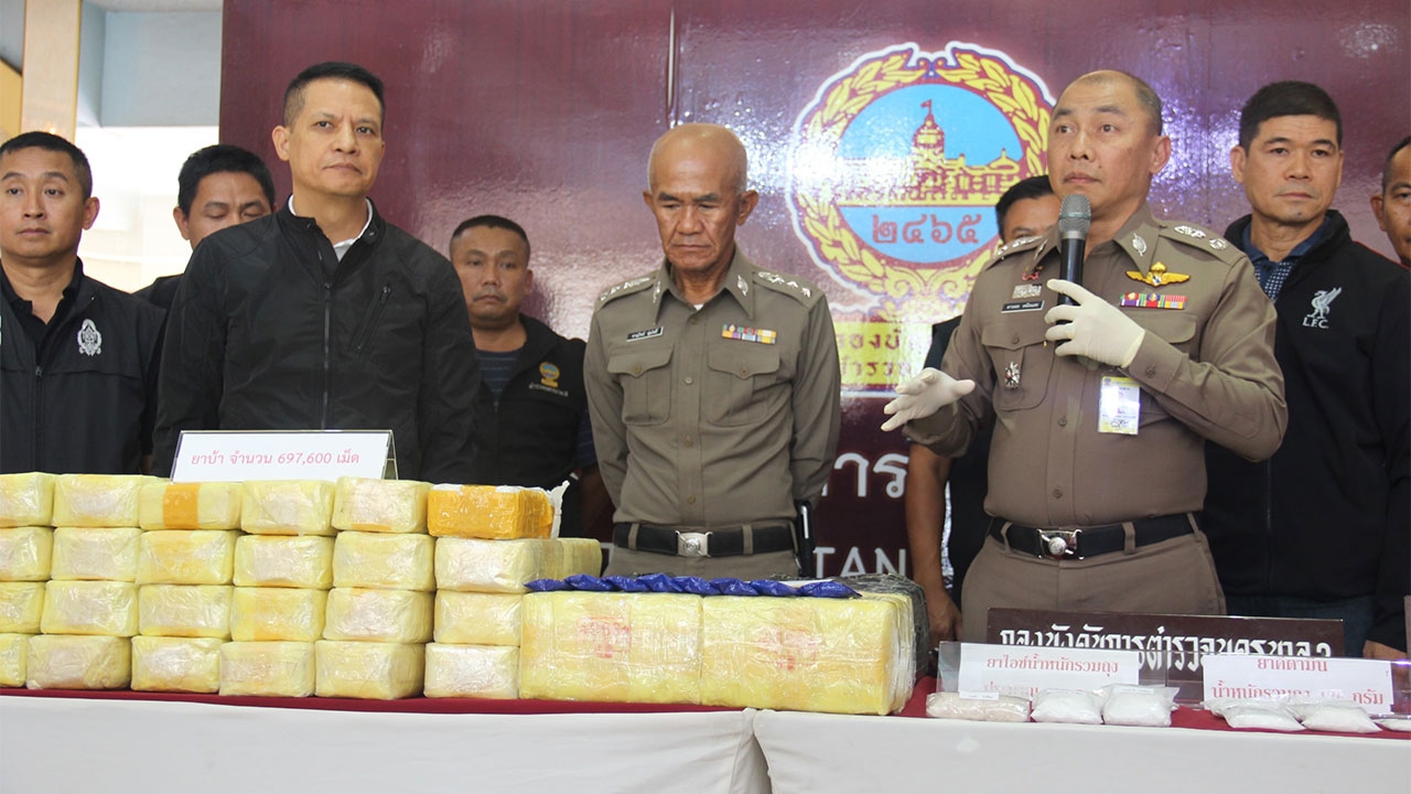 ตำรวจนครบาลจับกุมยาเสพติด-อาวุธปืนหลายคดี โดยเมื่อเวลา 11.00 น. วันที่ 22 มี.ค. ที่กองบัญชาการตำรวจนครบาล (บช.น.) พล.ต.ต.ดาวลอย เหมือนเดช รอง ผบช.น. พล.ต.ต.นิตินันท์ เพชรบรม รอง ผบช.น. พ.ต.อ.คมกฤษณ์ คำบุศย์ ผกก.สน.มีนบุรี พ.ต.ท.นิเวชร์ งามลาภ รอง ผกก.สส.สน.มีนบุรี และชุดสืบสวน กก.สส.บก.น.3 ร่วมกันแถลงข่าวผลจับกุมนายคณาธิป หรือไอซ์ บำรุงไทย อายุ 25 ปี อยู่บ้านเลขที่ 2/34 ถนนโชคชัย 4 ซอย 20 แขวงและเขตลาดพร้าว กทม. และ น.ส.เบญจมาศ หรืออาย ชูชื่น อายุ 19 ปี อยู่บ้านเลขที่ 34 หมู่ 7 ต.หาดขาม อ.กุยบุรี จ.ประจวบคีรีขันธ์ พร้อมยาบ้า 697,600 เม็ด ยาไอซ์ 681.5 กรัม และเคตามีน 426 กรัม