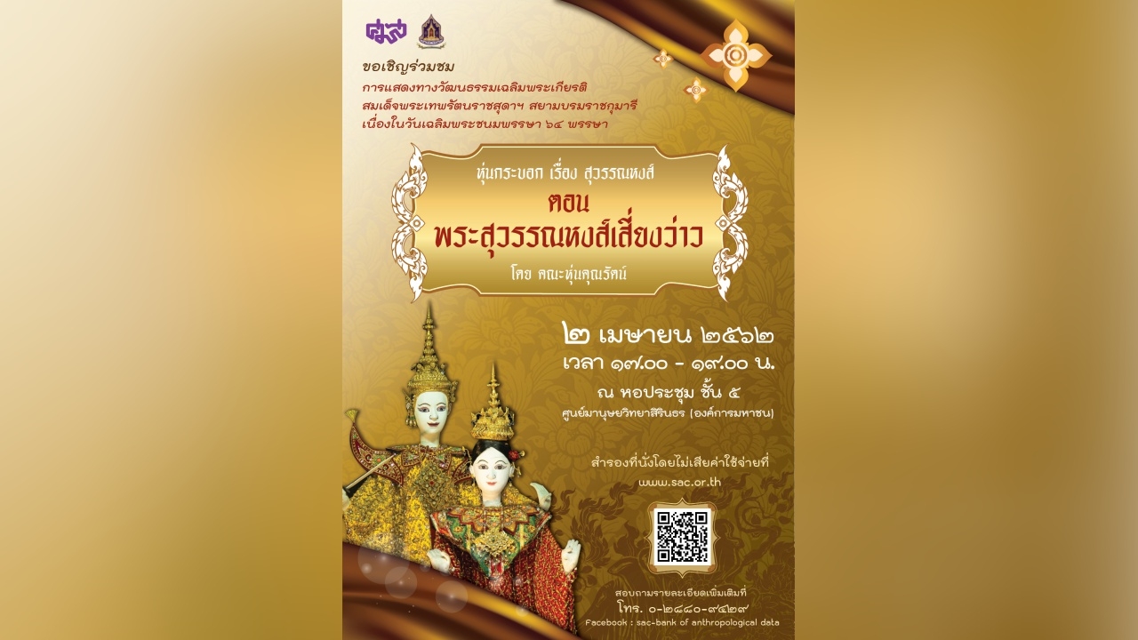 นายพีรพน พิสณุพงศ์ ผอ.ศูนย์มานุษยวิทยาสิรินธร (องค์การมหาชน) (ศมส.) กล่าวว่า เนื่องในโอกาสวันคล้ายวันพระราชสมภพ สมเด็จพระเทพรัตนราชสุดาฯ สยามบรมราชกุมารี 2 เม.ย. 2562 น้อมสำนึกในพระมหากรุณาธิคุณ จึงจัดการแสดงทางวัฒนธรรมเฉลิมพระเกียรติ ในชุดการแสดงหุ่นกระบอก เรื่อง สุวรรณหงส์ ตอน "พระสุวรรณหงส์เสี่ยงว่าว" โดย คณะหุ่นคุณรัตน์