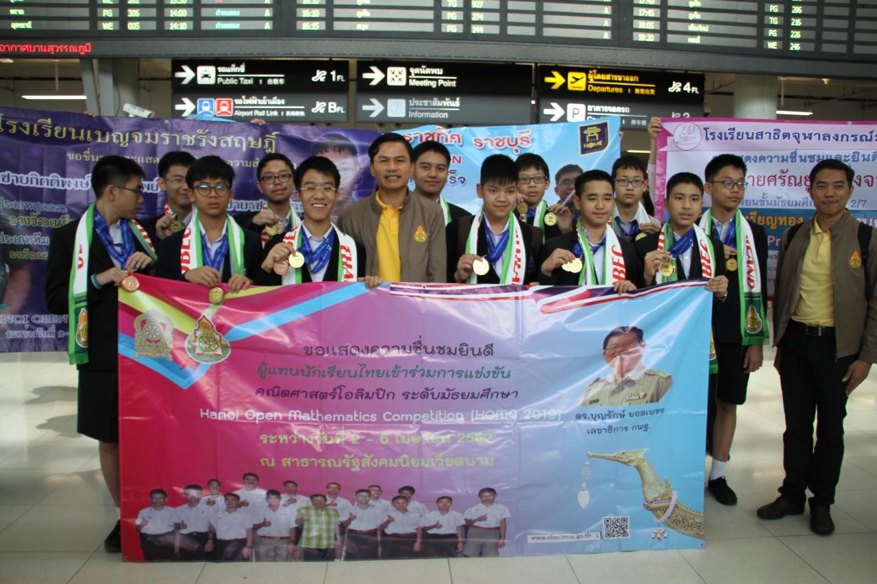 เมื่อเวลา 13.30 น. วันที่ 6 เม.ย.62 ดร.ภูธร จันทะหงษ์ ผู้อำนวยการกลุ่มวิจัยและพัฒนาองค์กรแห่งการเรียนรู้ สพฐ. พร้อมคณะ พร้อมครู และผู้ปกครอง เดินทางมารับนักเรียนจำนวน 12 คน แบ่งเป็นระดับมัธยมศึกษาตอนต้น 6 คน และระดับมัธยมศึกษาตอนปลาย 6 คน ที่เข้าร่วมการแข่งขันคณิตศาสตร์โอลิมปิก ระดับมัธยมศึกษา ประจำปี 2562 Hanoi Open Mathematics Competition (HOMC 2019) ระหว่างวันที่ 2 - 6 เม.ย.62 ณ เมืองฮานอย ประเทศเวียดนาม ที่เดินทางกลับถึงสนามบินท่าอากาศยานสุวรรณภูมิ ด้วยสายการบินไทย เที่ยวบินที่ TG 561