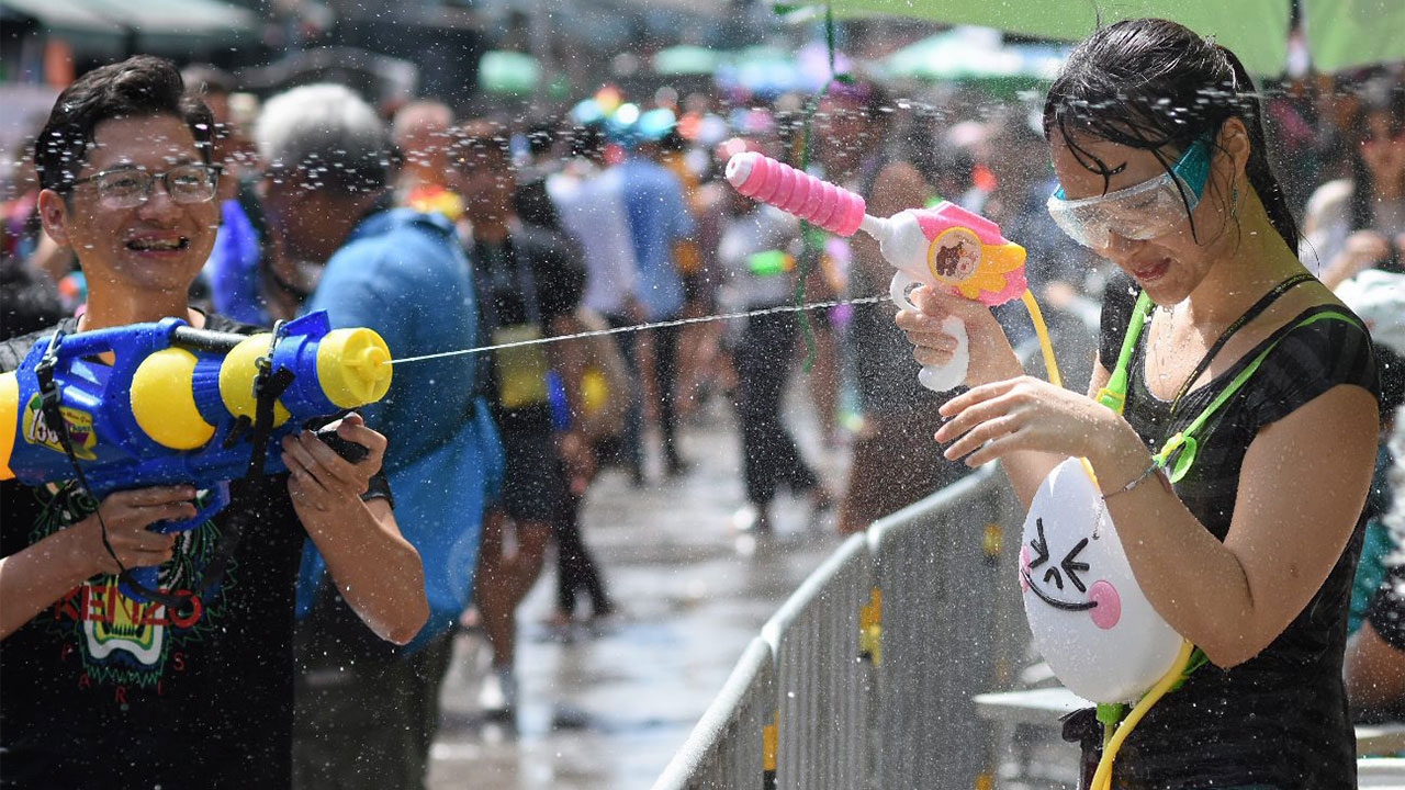 นักท่องเที่ยวหนุ่มสนุกสนานไปกับการใช้ปืนฉีดน้ำใส่สาวที่เปียกชุ่มไปทั้งตัวแล้ว ในพื้นที่ถนนข้าวสาร กทม. ที่มีการอนุญาตให้เล่นน้ำสงกรานต์ได้อย่างเต็มที่ เมื่อวันที่ 15 เม.ย. ซึ่งเป็นวันสุดท้ายของเทศกาลสงกรานต์ปีนี้.