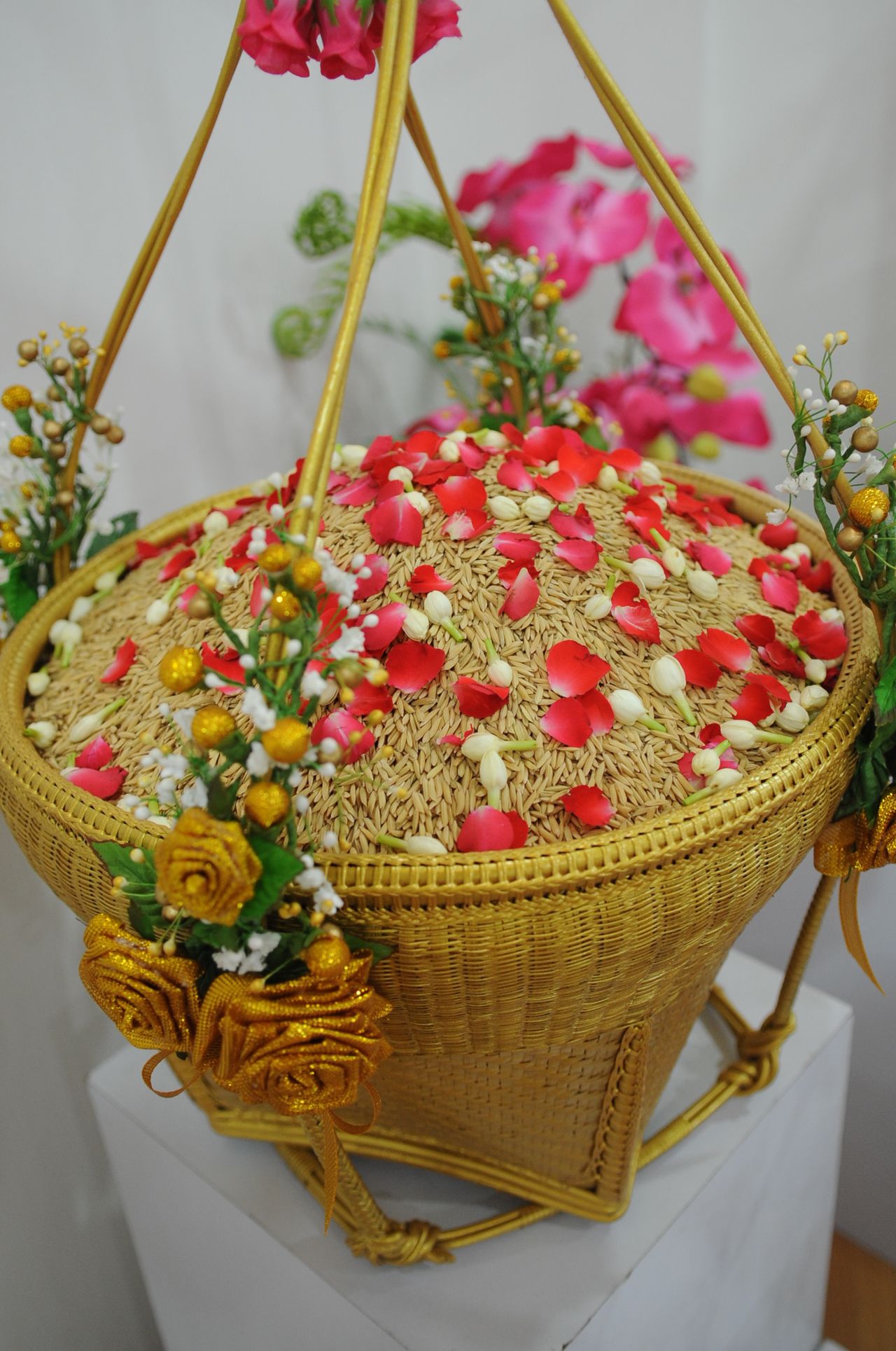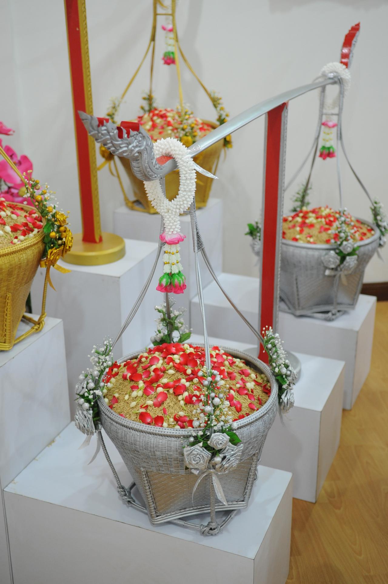 นายประสงค์ กล่าวต่อไปว่า นอกจากนี้กรมการข้าวยังได้จัดเตรียมกระบุงข้าว หรือที่เรียกว่า คู่หาบเงิน–คู่หาบทอง สำหรับให้เทพีคู่หาบเงิน–คู่หาบทอง ใช้หว่านในวันพระราชพิธีฯ ซึ่งกระบุงข้าว ประกอบด้วย ไม้ไผ่สีสุกนำมาจักเป็นเส้น แล้วหลาวให้ได้ขนาดเดียวกัน นำมาจักสานเป็นกระบุงข้าว จำนวน 8 ใบ ทำการพ่นสีเงิน 4 ใบ และพ่นสีทอง 4 ใบ สำหรับใช้กับเทพีคู่หาบเงิน 2 ชุด และคู่หาบทอง 2 ชุด ในส่วนไม้คาน จะแกะสลักด้วยไม้สักทอง โดยส่วนหัวไม้คานจะแกะสลักเป็นรูปหัวพญานาค ส่วนหางไม้คานจะแกะสลักเป็นหางพญานาค ตัวไม้คานจะใช้ไม้ไผ่สีสุกที่มีจำนวน 8 ข้อ ความยาวประมาณ 110 เซนติเมตร หรือ 46 นิ้ว โดยแต่ละข้อจะมีความหมายว่า ข้อที่ 1 คาน – ข้อที่ 2 แคน – ข้อที่ 3 ยาก – ข้อที่ 4 แค้น – ข้อที่ 5 มั่ง – ข้อที่ 6 มี – ข้อที่ 7 สี – ข้อที่ 8 สุก เพื่อความเป็นสิริมงคลแก่อาชีพเกษตรกร