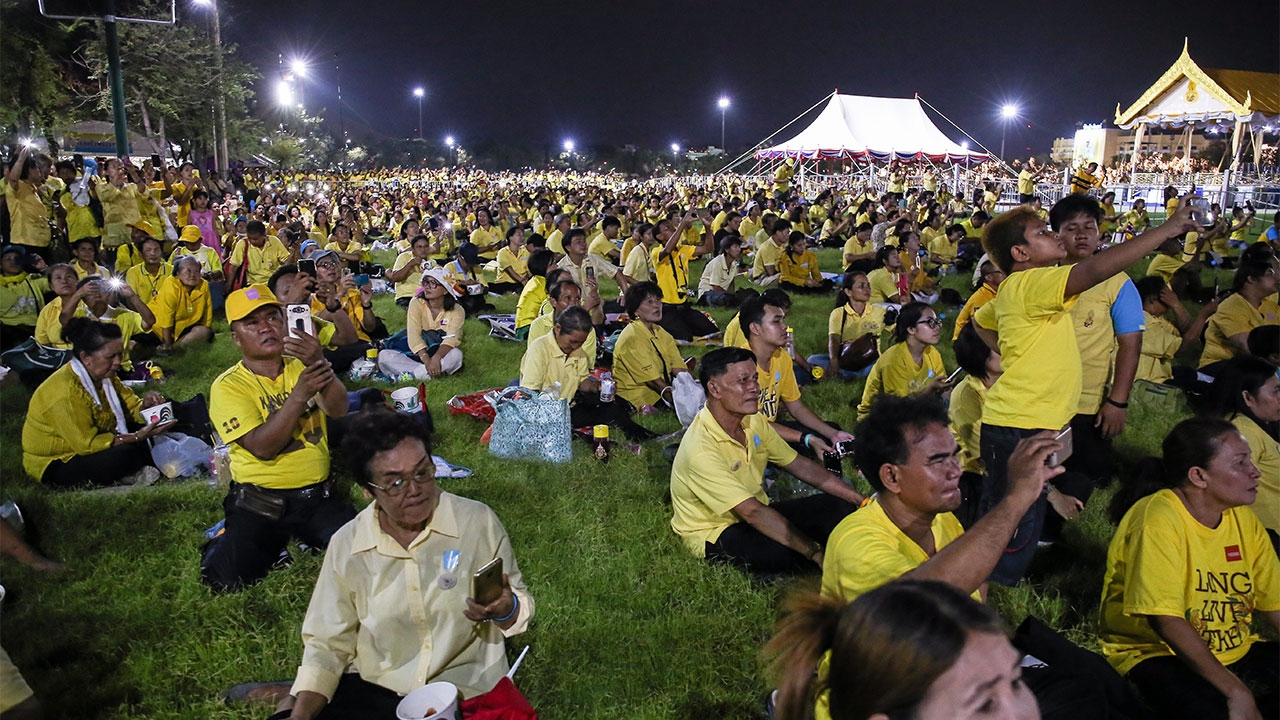 ประชาชนจำนวนมากที่มารอชมการแสดงโดรนแปรอักษรเฉลิมพระเกียรติถวายในหลวงรัชกาลปัจจุบันบริเวณท้องสนามหลวง.