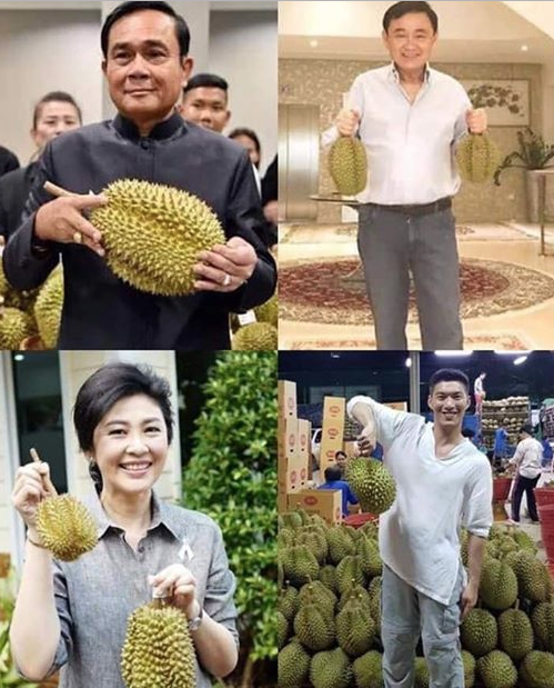 โลกโซเชียลแชร์ภาพถ่าย 4 บุคคลสำคัญแวดวงการเมืองไทยถือทุเรียนโชว์กันให้ว่อน ประกอบไปด้วยภาพของ "ลุงตู่" พลเอกประยุทธ์ จันทร์โอชา, นายทักษิณ ชินวัตร อดีตนายกรัฐมนตรี, นางสาวยิ่งลักษณ์ ชินวัตร อดีตนายกรัฐมนตรี และ นายธนาธร จึงรุ่งเรืองกิจ หัวหน้าพรรคอนาคตใหม่ แต่ละคนมีลีลาท่าทางการถือทุเรียนที่แตกต่างกันไป ส่วนชาวเน็ตพากันวิพากษ์วิจารณ์ ท่าถือของใครโง่ ท่าถือของใครฉลาด ท่าถือของใครยอมเจ็บทำเพื่อชาติ ฯลฯ