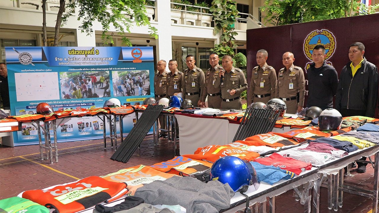 น.1 นำทีมชุดคลี่คลายคดีศึกวินรถ จยย. ย่านซอยอุดมสุข มาแถลงผลความคืบหน้า สามารถจับกุมผู้ต้องหาแล้ว 43 คน พร้อมปืน 2 กระบอก มีด กระบองยาง อีกจำนวนมาก เผยคดีนี้มีคนเจ็บรวม 5 ราย 1 ในนั้นโดนพวกเดียวกันเองยิงที่หัว อยู่ระหว่างขยายผลเงินที่เรียกเก็บจากลูกวิน นำไปแจกจ่ายกลุ่มอิทธิพลใดบ้าง