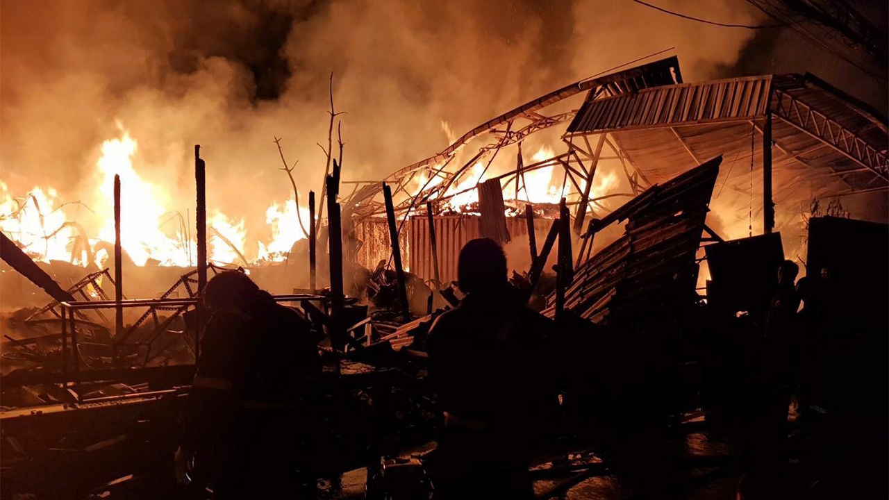 เจ้าหน้าที่ดับเพลิงต่างระดมฉีดน้ำดับเพลิงโหมลุกไหม้โรงงานเฟอร์นิเจอร์ บ.กิตระพี จำกัด ซอยลาซาล 49 เขตบางนา กทม. เพลิงไหม้โกดังขนาด 3 ไร่ ใช้เก็บไม้พาเลตและไม้แปรรูปถูกเผาจนหลังคาพังถล่มเสียหายทั้งหลัง.