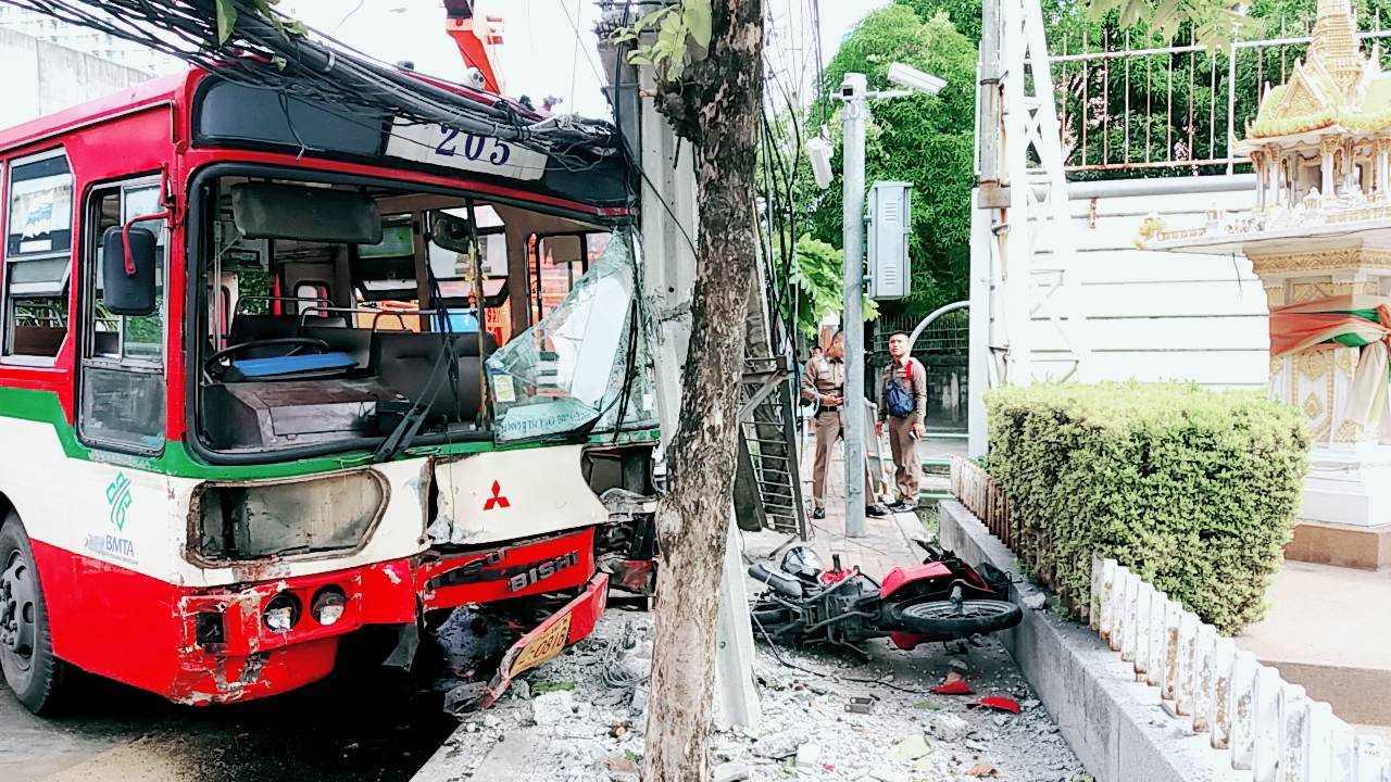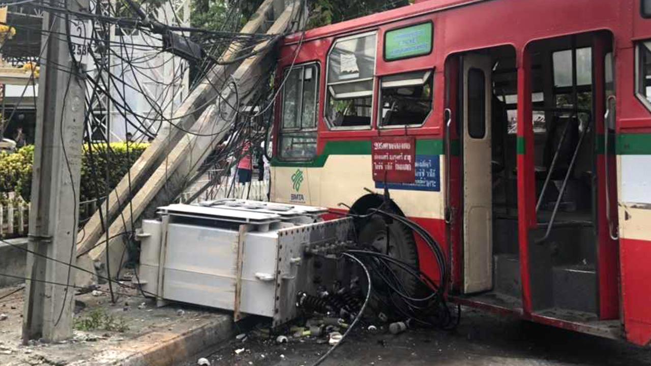 ฝนตกในกทม. รถเมล์สาย 205 ท่าพระ-คลองเตย ชนรถปิกอัพ ก่อนเสียหลักปีนเกาะกลางชนจยย. ก่อนไปหยุดที่เสาไฟฟ้า จนหม้อแปลงตกลงมา มีผู้บาดเจ็บ 2 คน โชเฟอร์รถเมล์บอกปิกอัพเลี้ยวกลับกะทันหัน