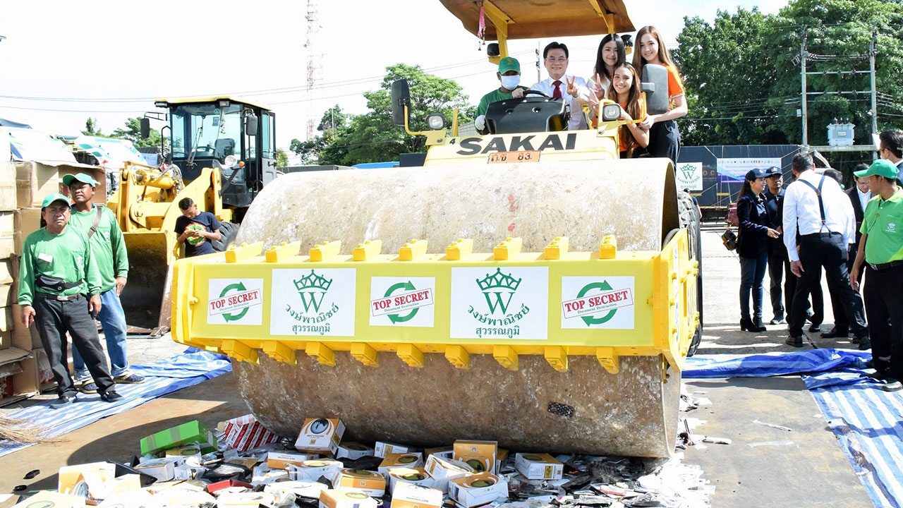 นายจุรินทร์ ลักษณวิศิษฏ์ รองนายกรัฐมนตรี และ รมว.พาณิชย์ นั่ง รถบดทำลายของกลางคดีละเมิดทรัพย์สินทางปัญญา ที่คดีถึงที่สุด หลัง เดินทางมาเป็นประธาน ในพิธีที่ลานอเนกประสงค์ กองพันทหารปืนใหญ่ต่อสู้อากาศยานที่ 7 กรม ทหารปืนใหญ่ต่อสู้อากาศยานที่ 1 ดอนเมือง ในปีนี้มีของกลางถูกนำมาทำลาย กว่า 10 ล้านชิ้น.
