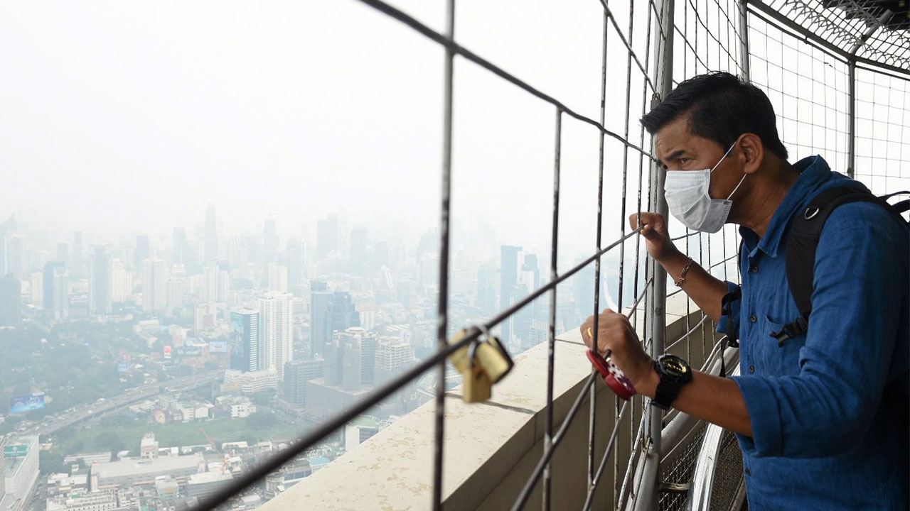 ภาพจากชั้น 84 ตึกใบหยก 2 ที่เห็นได้ชัดว่าทัศนวิสัยในการมองเห็นเมืองกรุงเทพฯ ที่เคยแจ่มชัดกลับขมุกขมัวจากฝุ่น PM2.5 ที่ปกคลุมไปทั่ว ทำให้คุณภาพอากาศแย่ ประชาชนต้องกลับมาสวมหน้ากากอนามัยป้องกันฝุ่นแล้ว.