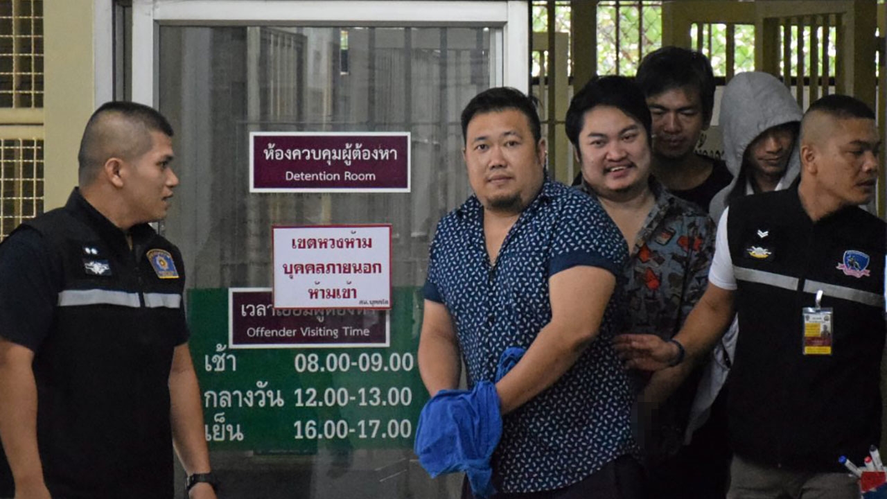 ตำรวจคุมตัวนายนที หรือตี๋ สถิตพงษ์สถาพร (กลาง) และนายชัยพล หรือคิว พรรณา (ยิ้ม) 2 ใน 5 ผู้ต้องหาคดีลันลาเบล ออกจากห้องขังไปส่งศาลฝากขัง ปรากฏว่านายตี๋ นายคิว และ น.ส.เฟิร์สหาเงินประกันไม่ทันถูกส่งเข้าเรือนจำ.