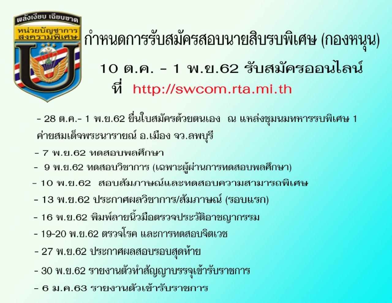 การรับสมัครต้องกรอกข้อมูลลงทะเบียนผ่านเว็บไซต์ swcom.rta.mi.th/swcom-recruit ตั้งแต่วันที่ 10 ตุลาคม - 1 พฤศจิกายน 2562 ก่อนพิมพ์ใบสมัครที่กรอกข้อมูลทางเว็บไซต์ นำไปสมัครด้วยตนเองตั้งแต่วันจันทร์ที่ 28 ตุลาคม - 1 พฤศจิกายน 2562 เวลา 08.00 - 16.00 น. ณ แหล่งชุมนุมทหารรบพิเศษ (1) ภายในค่ายสมเด็จพระนารายณ์มหาราช