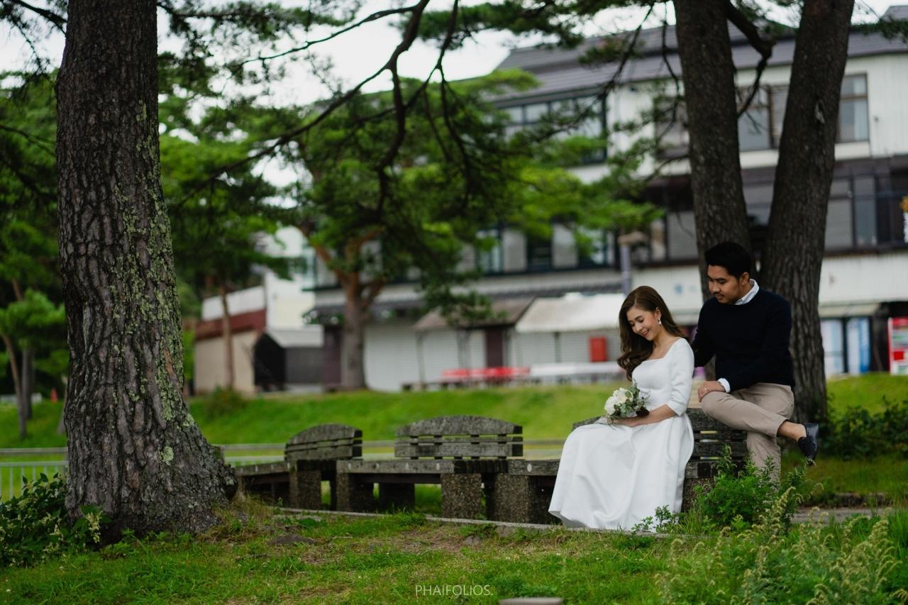 ขณะที่ พรีเวดดิ้งนั้น เธอบอกเล่าว่า “พีชมีโอกาสไปเที่ยวประเทศญี่ปุ่น จึงใช้จังหวะนี้นำชุดแต่งงานแบบเรียบๆ ไปถ่ายที่นั่น เราจึงได้ทั้งเที่ยว และได้ภาพพรีเวดดิ้งไปพร้อมๆ กัน โดยเรามีเพื่อนที่เป็นช่างภาพและช่างแต่งหน้าไปด้วย เราจึงดูแลค่ารถ และค่าใช้จ่ายบางส่วนให้แก่เพื่อนๆ รวมเบ็ดเสร็จไปเที่ยวญี่ปุ่น 8 คน 8 วัน เราออกค่าใช้จ่ายสำหรับเที่ยวและพรีเวดดิ้งเป็นเงินไม่ถึงแสนบาทค่ะ”