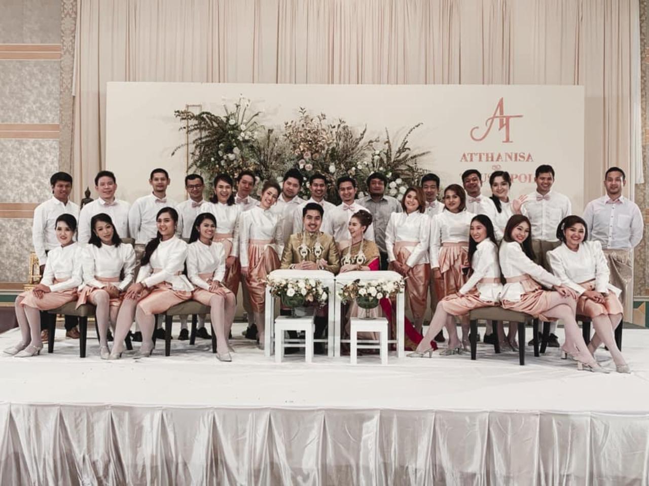 “ส่วนชุดเพื่อนเจ้าสาว ชุดเพื่อนเจ้าบ่าว เราเช่าชุดพิธีเช้าจากร้านในจังหวัดสุราษฎร์ธานี ส่วนชุดกลางคืน เราตัดให้เพื่อนๆ เพื่อเป็นการตอบแทนคำขอบคุณ โดยแบ่งเป็นเพื่อนเจ้าสาว 24 คน เพื่อนเจ้าบ่าว 10 คนค่ะ”