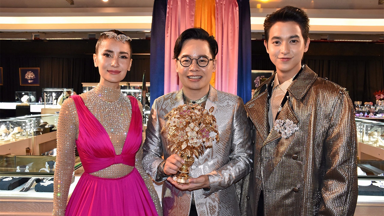 นายสุริยน ศรีอรทัยกุล แห่งบิวตี้ เจมส์ พร้อมสองดาราดัง แอน ทองประสมและเจมส์-จิรายุ ตั้งศรีสุข ที่ร่วมโชว์บูเก้ช่อดอกไม้ประดับอัญมณี มูลค่ารวม 300 ล้านบาท ในงาน “ดิ โอเอซิส ออฟ ไดมอนด์” ณ เซ็นทรัล ชิดลม.