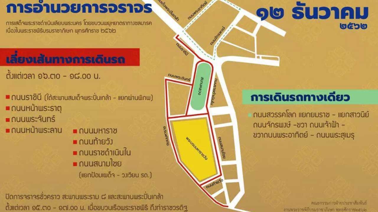 เผย ปิดถนน 12 ธ.ค. และจัดการจราจรบางจุดในกรุงเทพฯ ช่วงการพระราชพิธี การเสด็จพระราชดำเนินเลียบพระนคร โดยขบวนพยุหยาตราทางชลมารค