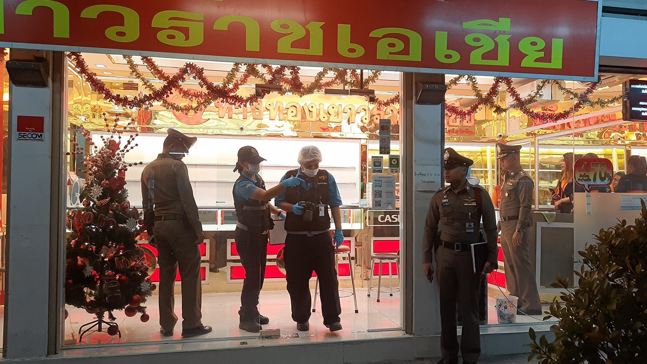 สอบสวนพยานที่เป็นพนักงานภายในร้าน ให้การว่าคนร้ายเป็นชาย ผิวขาว อายุประมาณ 25-30 ปี แต่งกายในชุดดำ สวมหมวกกันน็อก สูงประมาณ 170 ซม. เดินป้วนเปี้ยนอยู่หน้าร้านมีท่าทีพิรุธ พนักงานของร้านเห็นรีบปิดร้านล็อกประตูกระจก คนร้ายชักปืนยิงใส่ประตู 2 นัด เศษกระจกกระเด็นบาดคอพนักงานร้านได้รับบาดเจ็บ 1 คน จากนั้นคนร้ายวิ่งเข้ามากวาดสร้อยคอทองคำไปจำนวนหนึ่ง ก่อนจะวิ่งหลบหนีออกไปขึ้นรถ จยย.ที่จอดรออยู่