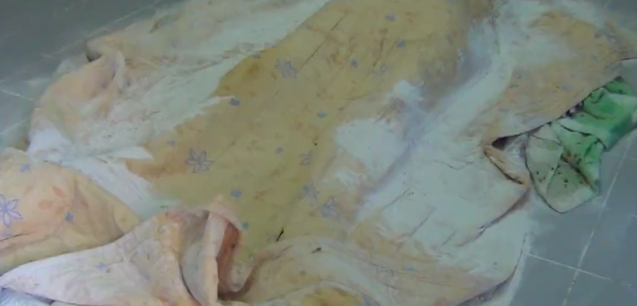 - สภาพศพเป็นชาย ใส่เสื้อเชิ้ต สวมกางเกงขาสั้น และสวมผ้าอ้อมผู้ใหญ่อยู่ด้านใน นอนหงายอยู่บนฟูกบริเวณชั้นล่างของตัวบ้าน มีผ้าห่มให้อย่างดี สภาพดำคล้ำ มีแมลงบินตอม โดยรอบถูกโรยด้วยปูนขาว คาดว่าเสียชีวิตมาแล้วไม่ต่ำกว่า 7 วัน