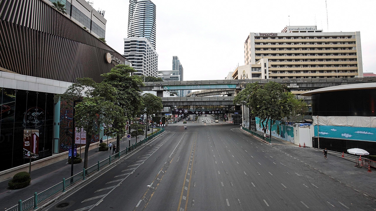 สภาพถนนบริเวณหน้าศูนย์การค้าเกษรวิลเลจ ย่านราชประสงค์ เขตปทุมวัน กทม. 1 ในถนนที่มีการจราจรติดขัดอันดับต้นๆของกรุงเทพมหานครกลับโล่งแทบไม่มีรถวิ่ง หลังประชาชนแห่เดินทางกลับบ้านและเที่ยวฉลองปีใหม่.