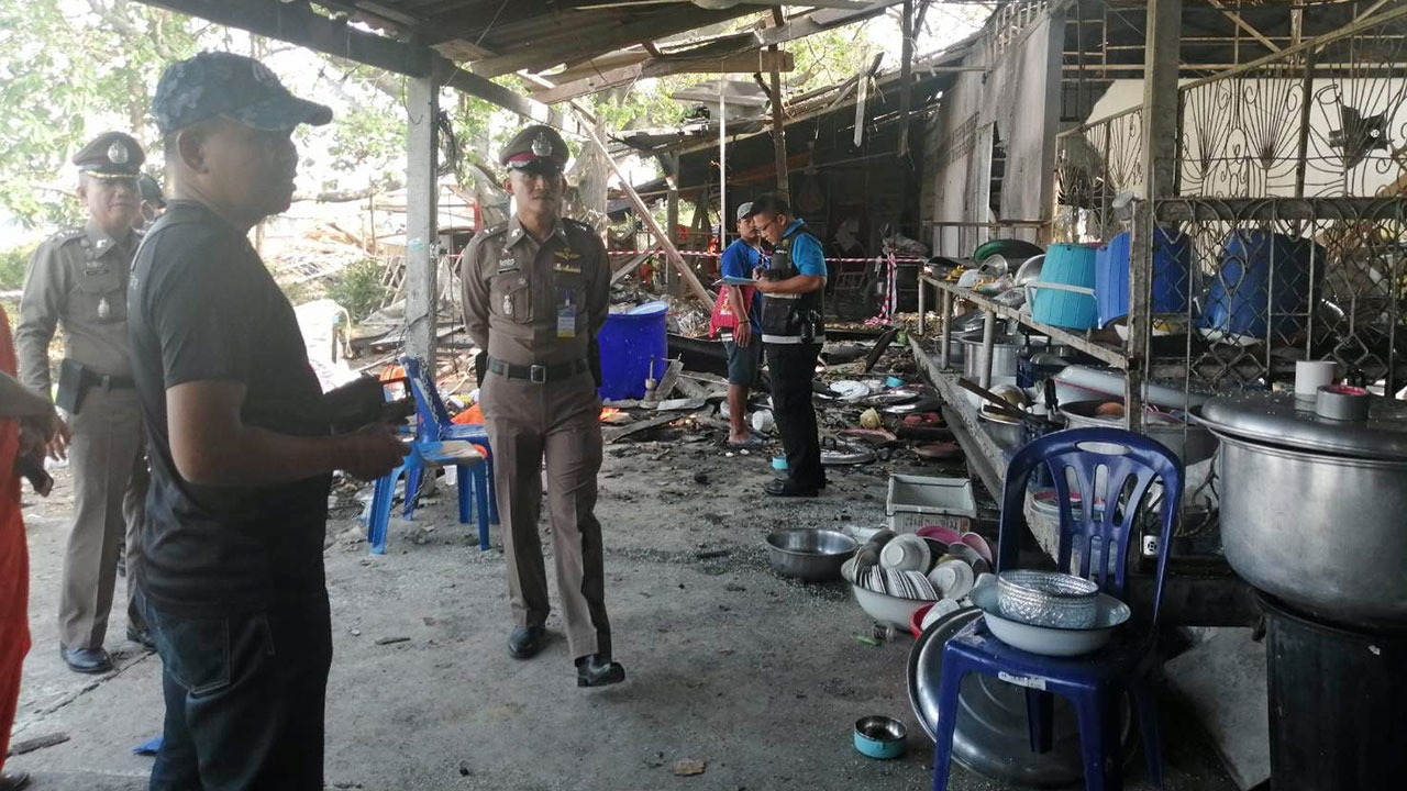 ที่เกิดเหตุอยู่ในโรงครัวหลังวัดเป็นเพิงมุงหลังคากระเบื้องชั้นเดียว พบศพนายฮลา ฮิเต อายุ 35 ปี ชาวพม่า สภาพนอนตะแคงขวาคว่ำหน้าอยู่ที่บริเวณลานหุงต้ม สวมเสื้อยืดแขนสั้นสีน้ำเงิน นุ่งโสร่งสีน้ำตาล บริเวณใบหน้าข้างขวามีบาดแผลถูกของแข็งกระแทกจนเละ ใกล้กันพบชิ้นส่วนโลหะของหม้อต้มไอน้ำขนาด 200 ลิตร แบบใช้ฟืนเป็นเชื้อเพลิง แตกกระจัดกระจายไปทั่วหลังจากเกิดการระเบิด แรงอัดส่งผลทำให้หลังคากระเบื้องแตกเป็นรูโหว่ ตู้หุงข้าวไอน้ำล้มคว่ำระเนระนาด นอกจากนี้ยังมีเศษถ้วย จาม ชาม ผักสด ข้าวสวย และของสดเตรียมไว้ทำกับข้าวเลี้ยงญาติโยมในช่วงเทศกาลปีใหม่กระเด็นเกลื่อนกลาด
