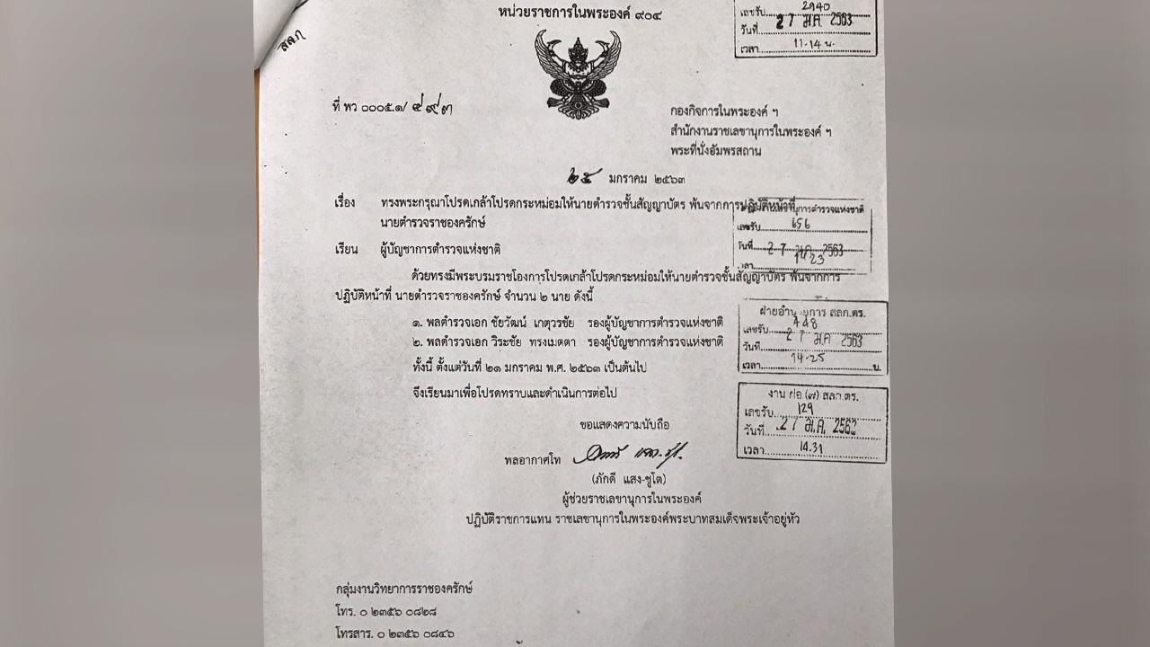 สำนักราชเลขานุการในพระองค์ฯ ส่งหนังสือถึง ผบ.ตร. โปรดเกล้าฯให้ "วิระชัย-ชัยวัฒน์" พ้นจากการปฏิบัติหน้าที่ นายตำรวจราชองครักษ์